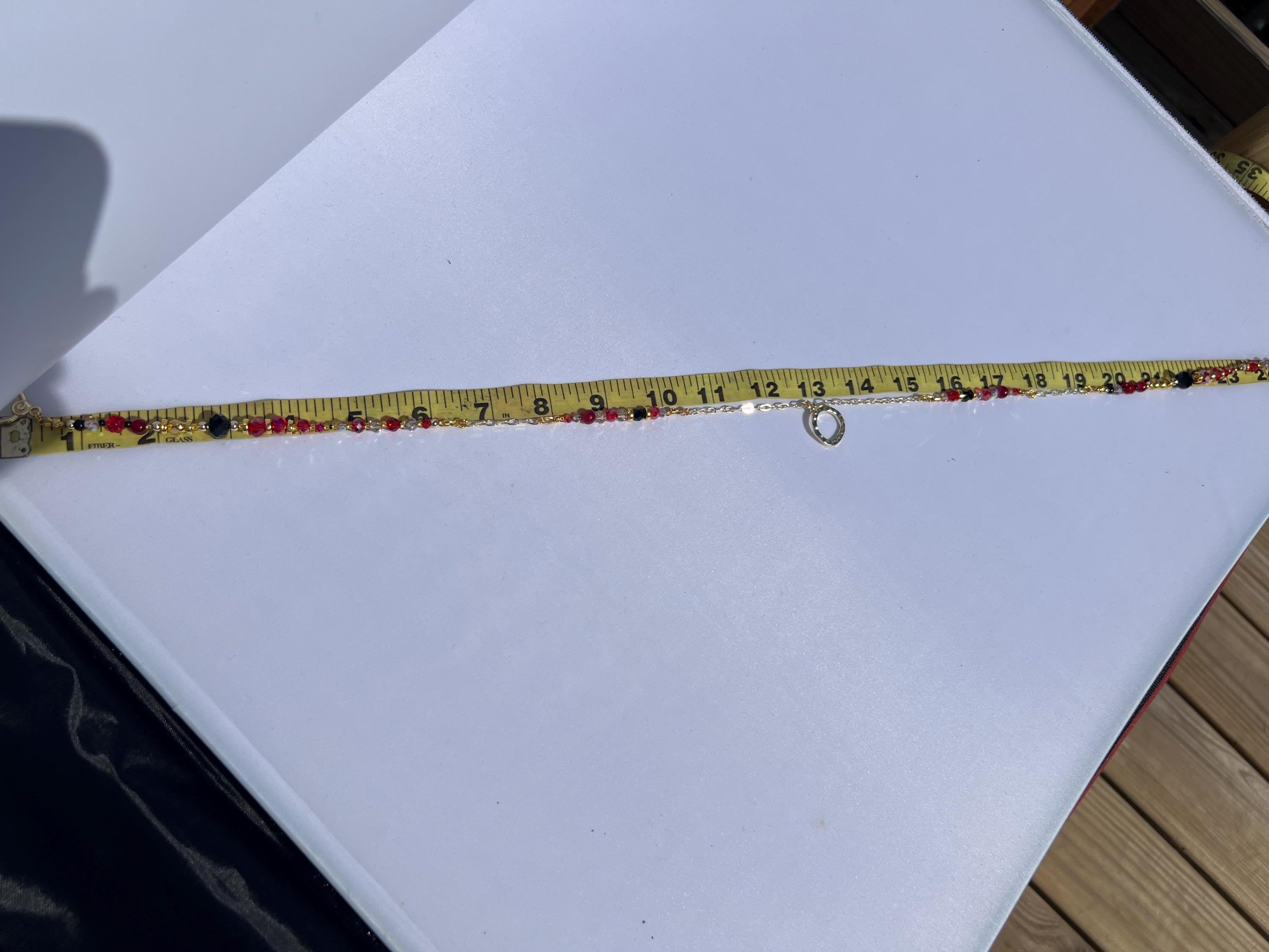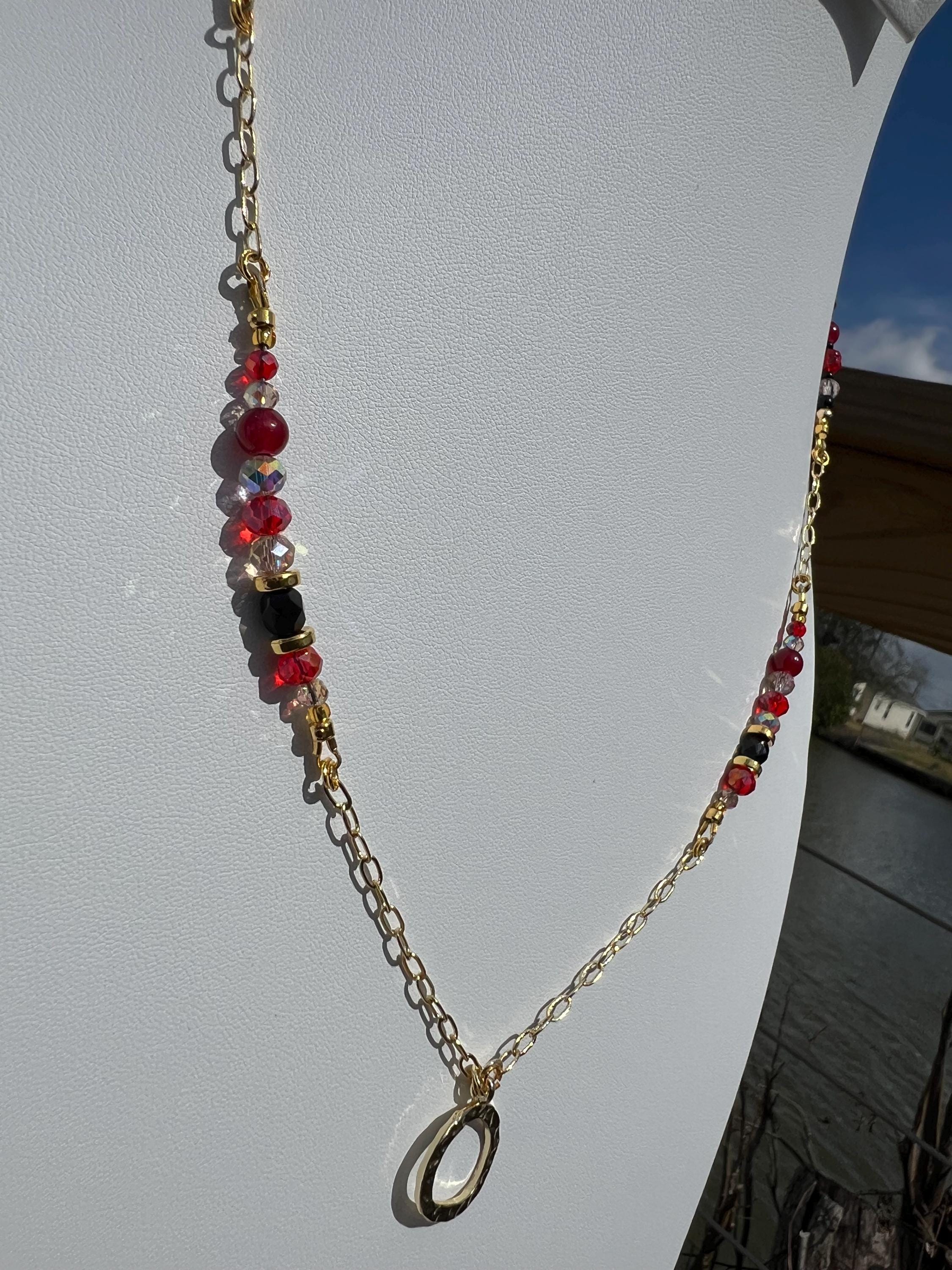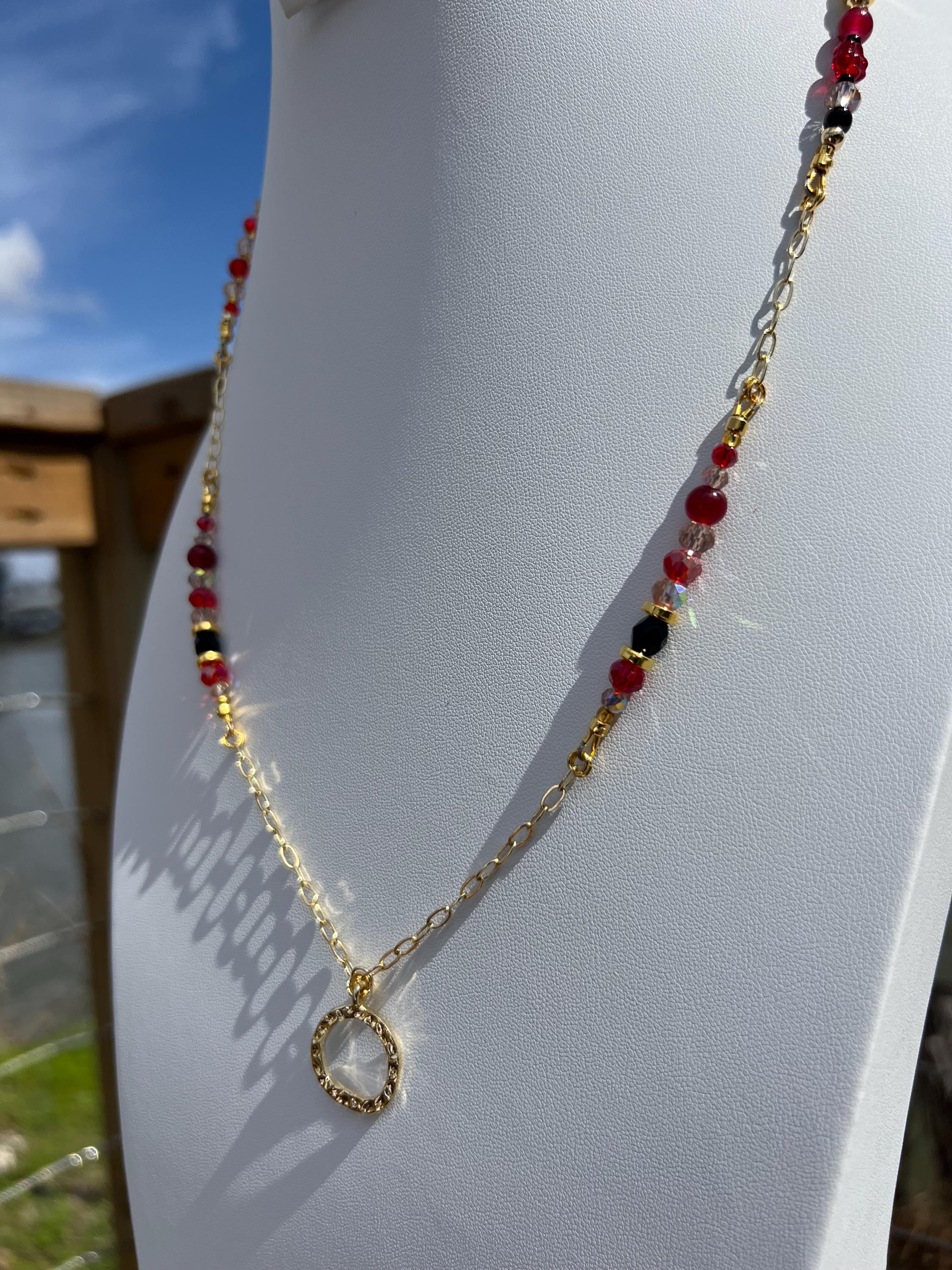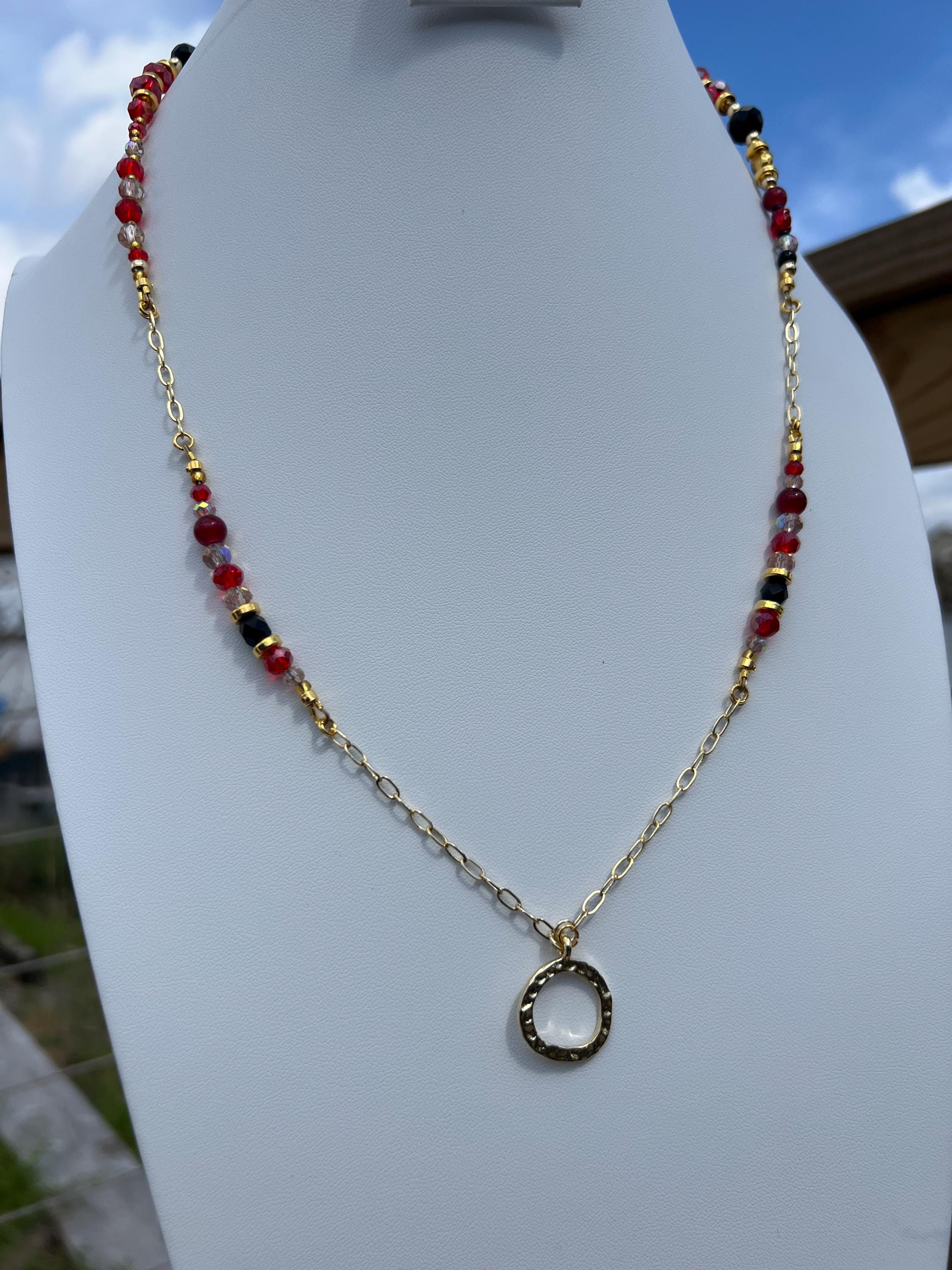 This asymmetrical red, black, and gold beaded necklace was created for evenings that call for confidence. Featuring a curated mix of glass, stone, metal, and bicone crystal beads, each piece balances texture and shine in a modern silhouette.