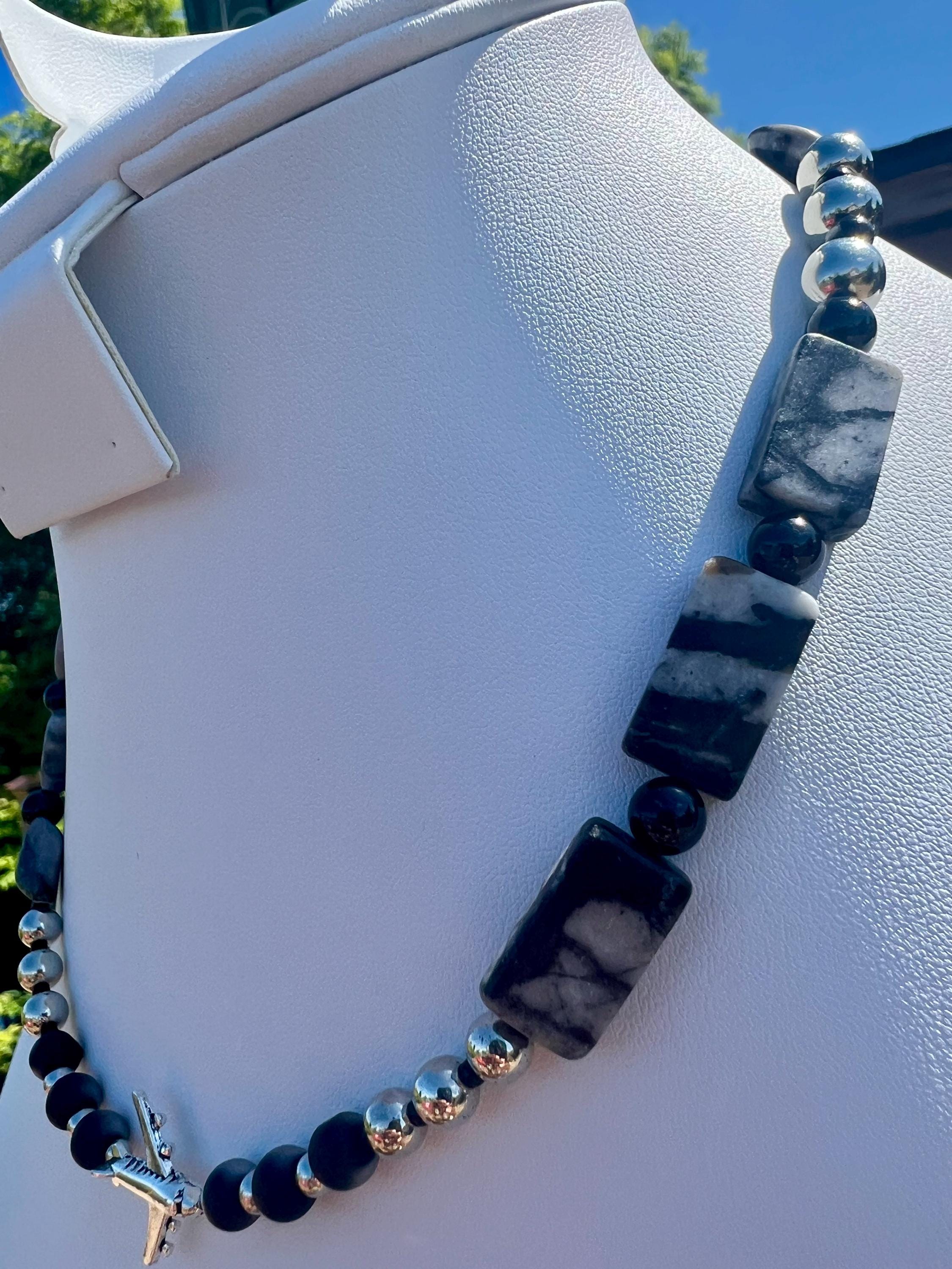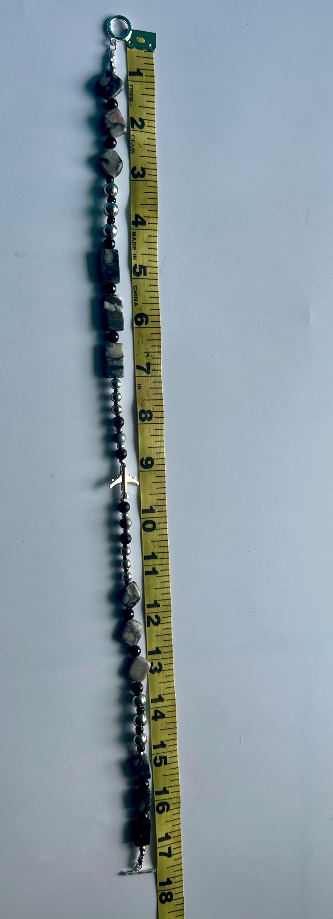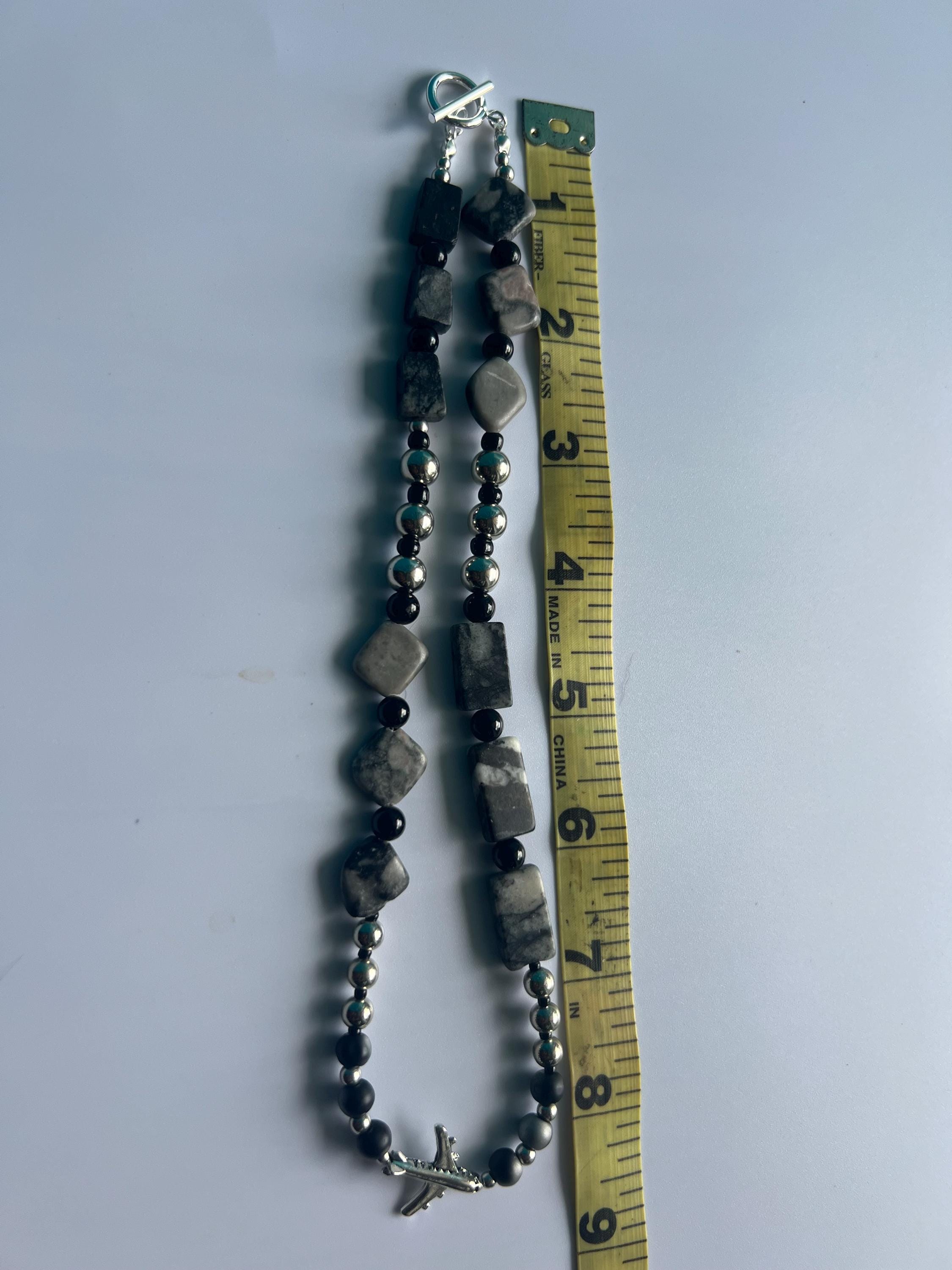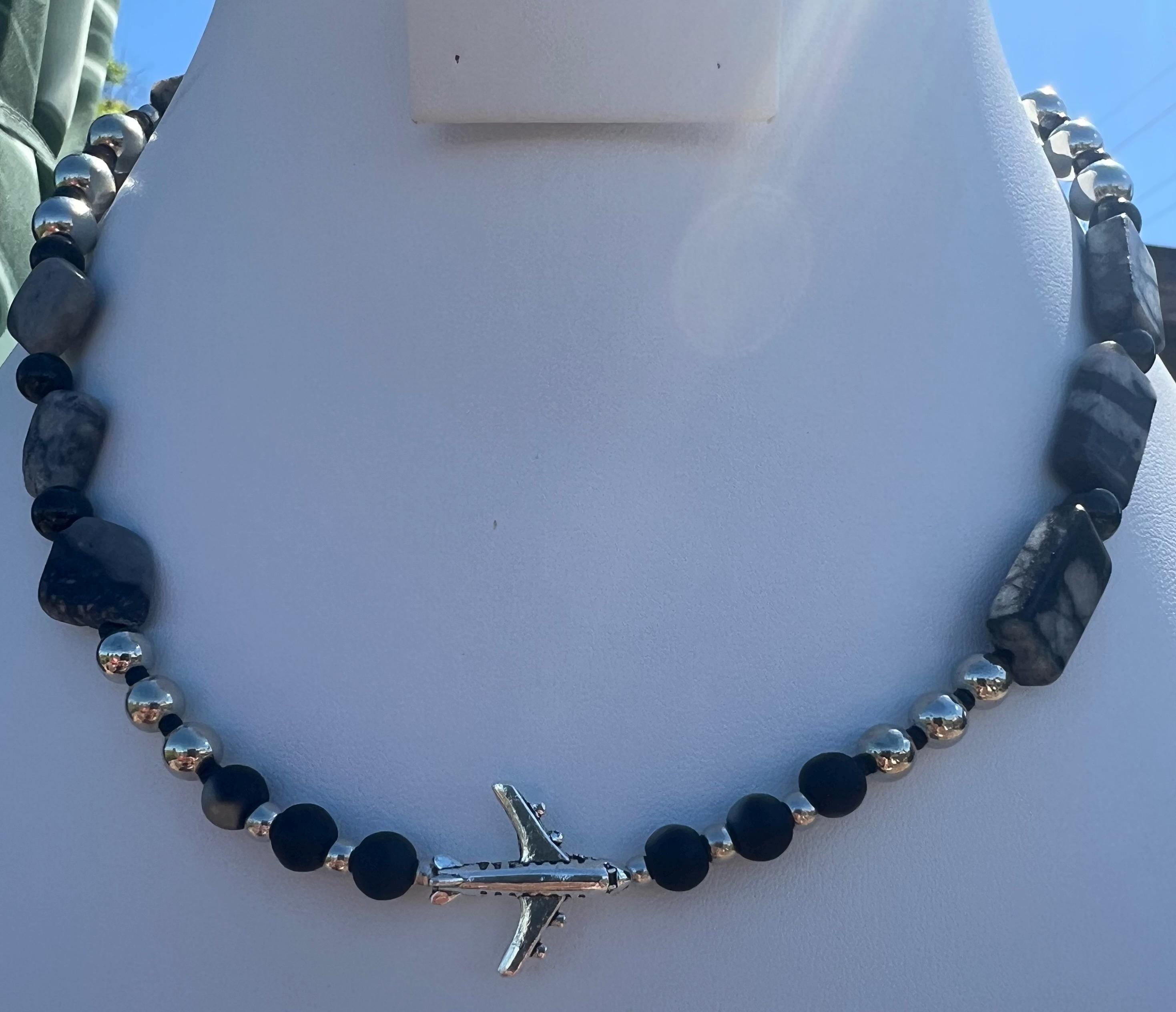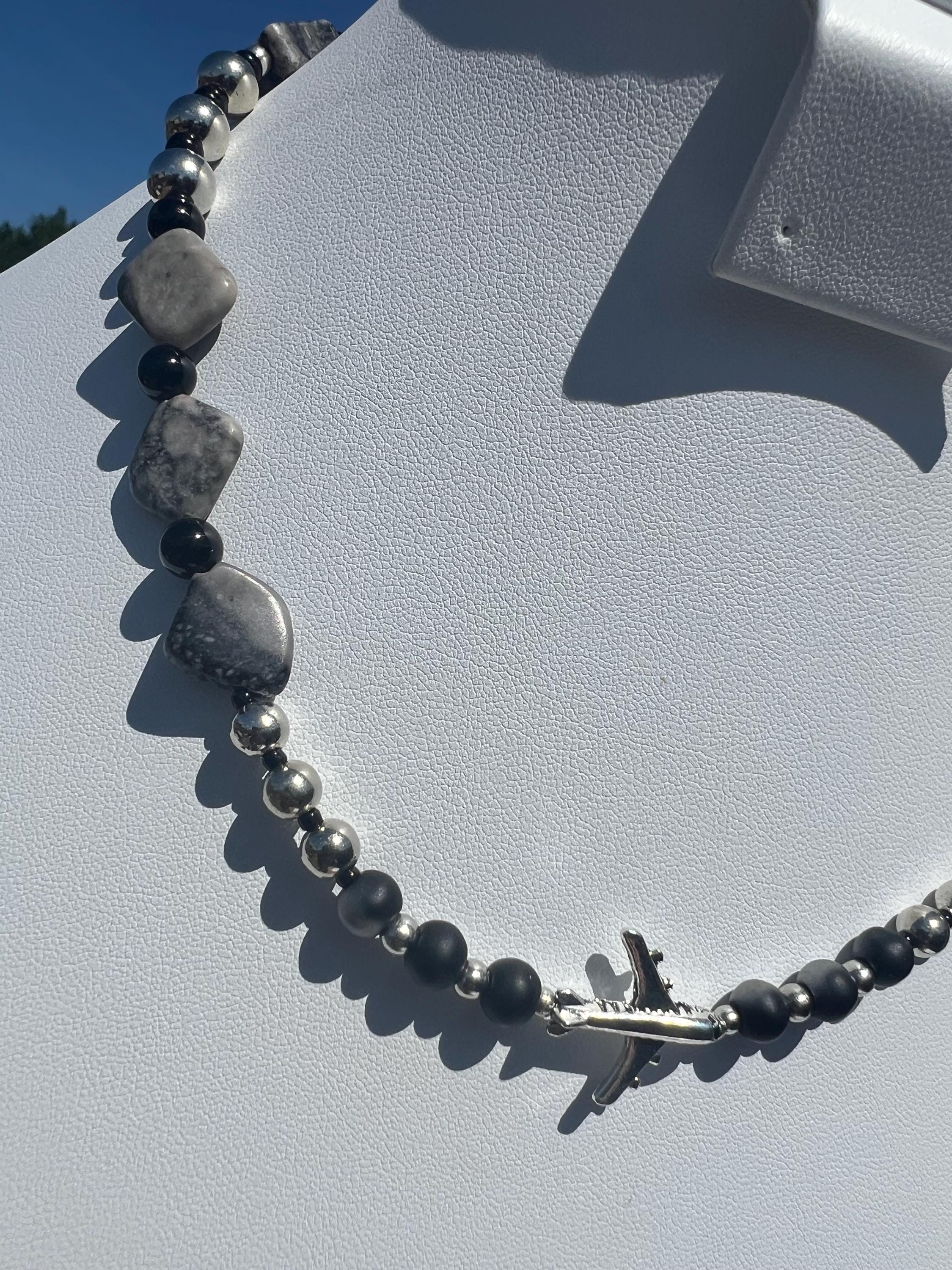 Handmade Unisex Airplane Necklace with Grey, Black & Steel Stones, Travel Lover Gift