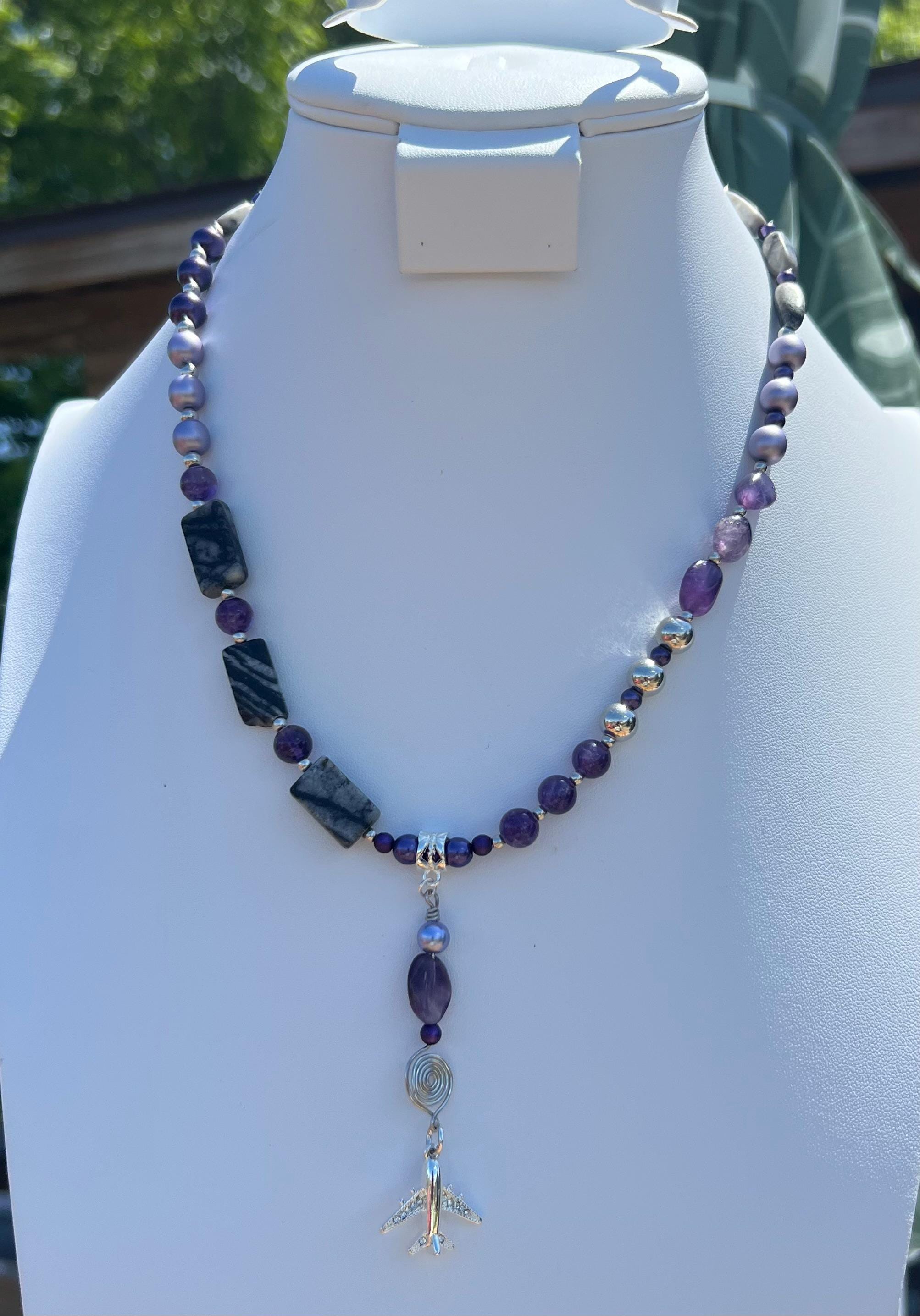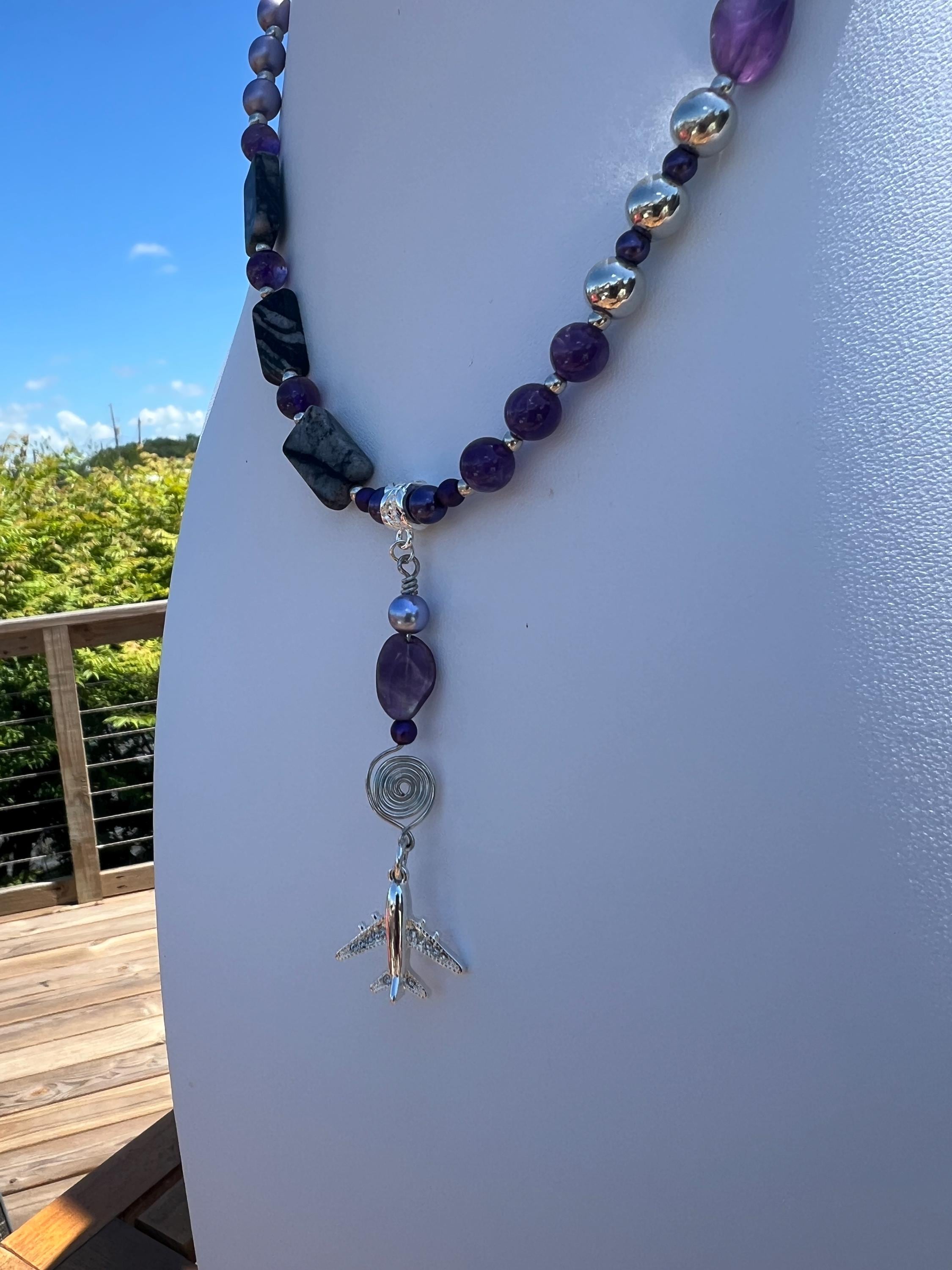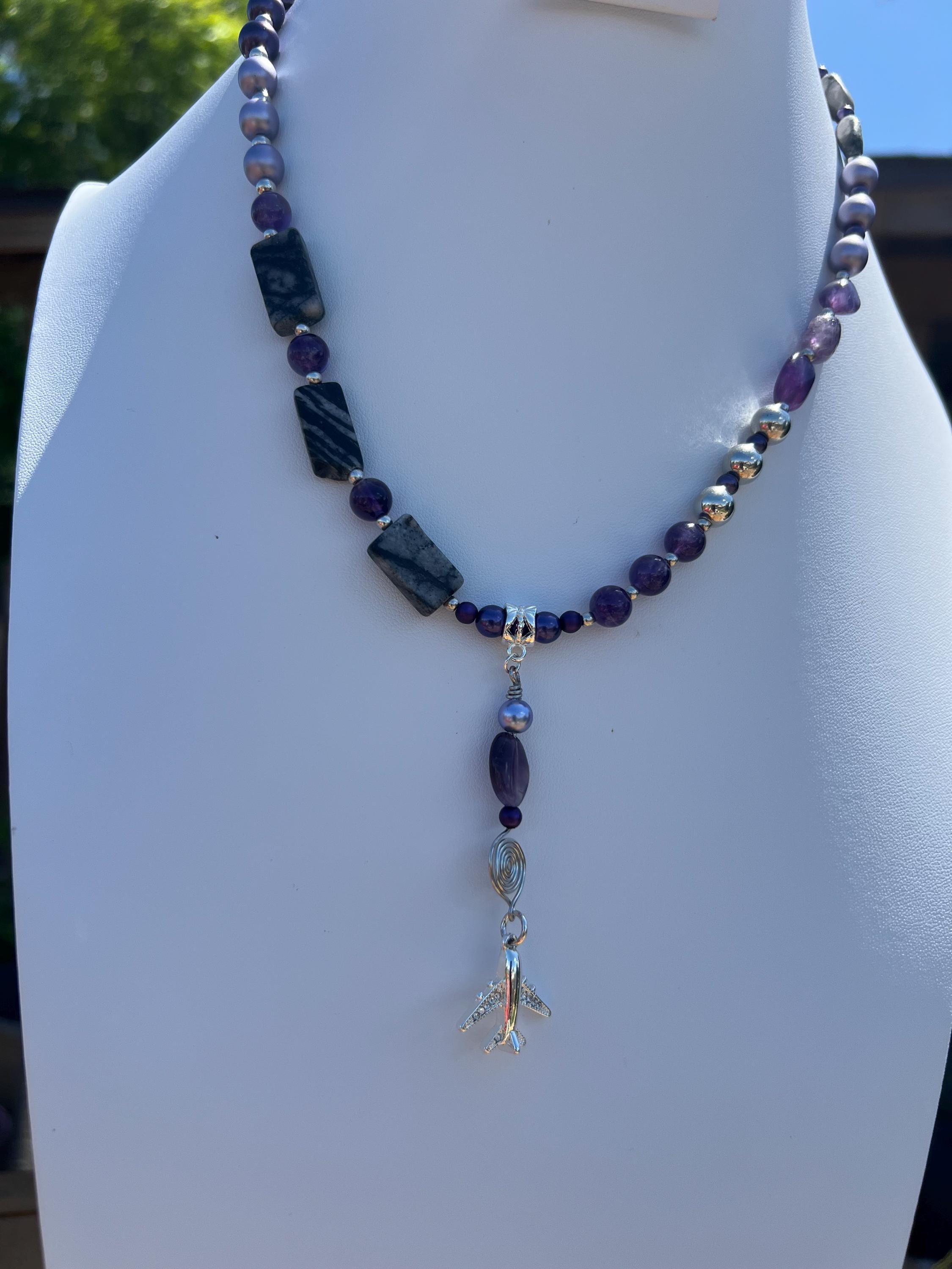 Handmade Airplane Necklace with Purple & Gray Stones and Beads, Travel Lover Gift