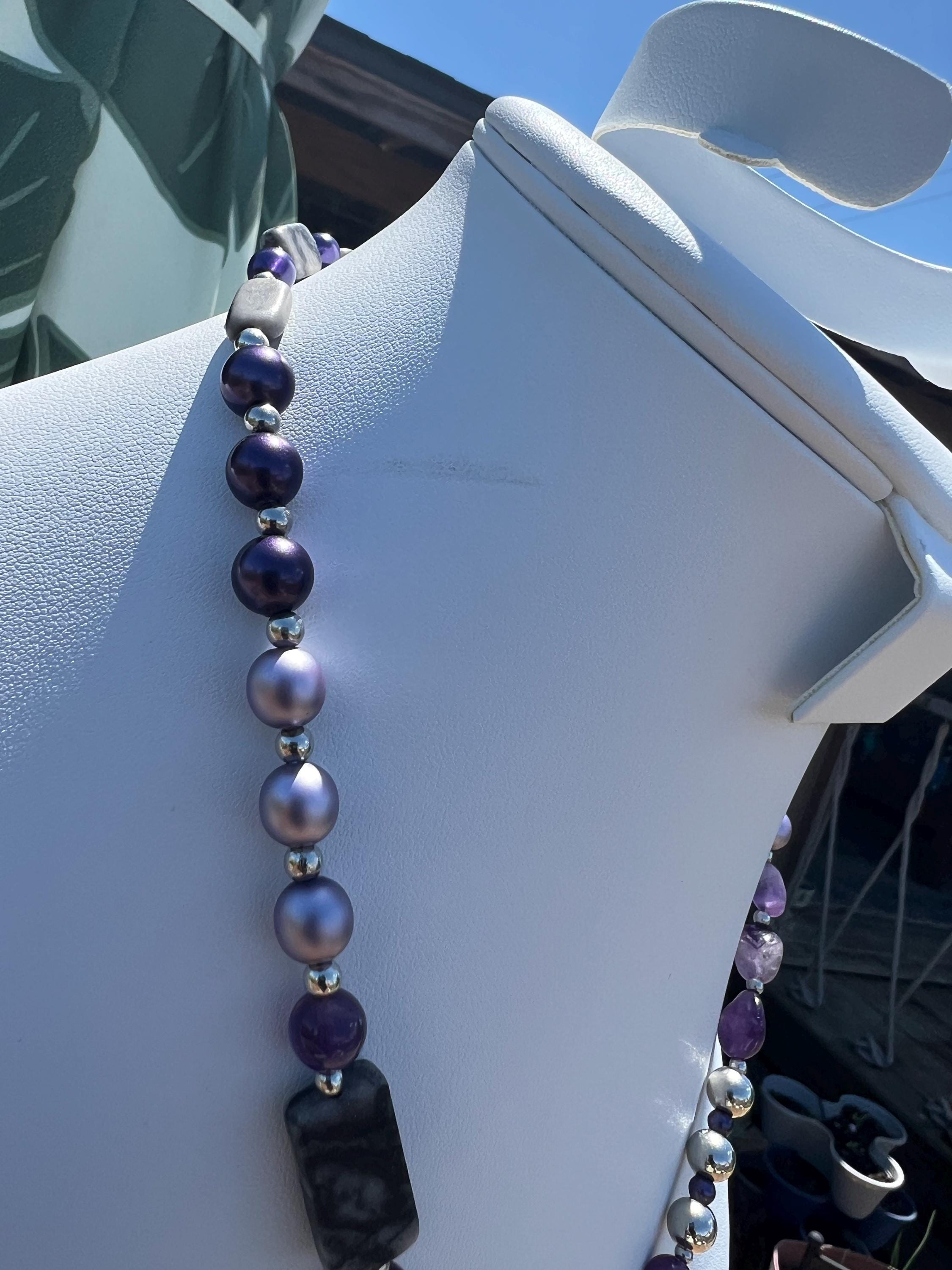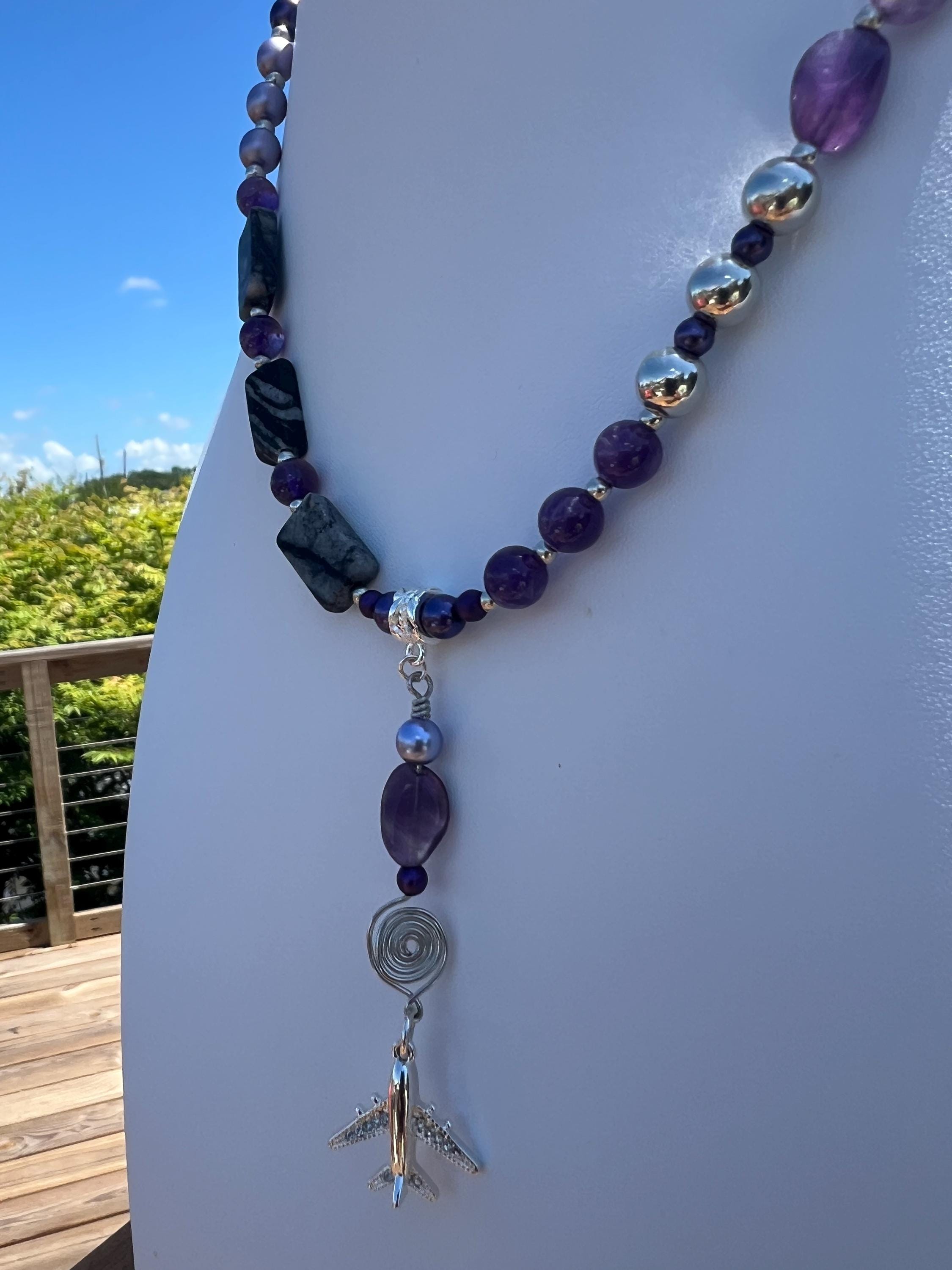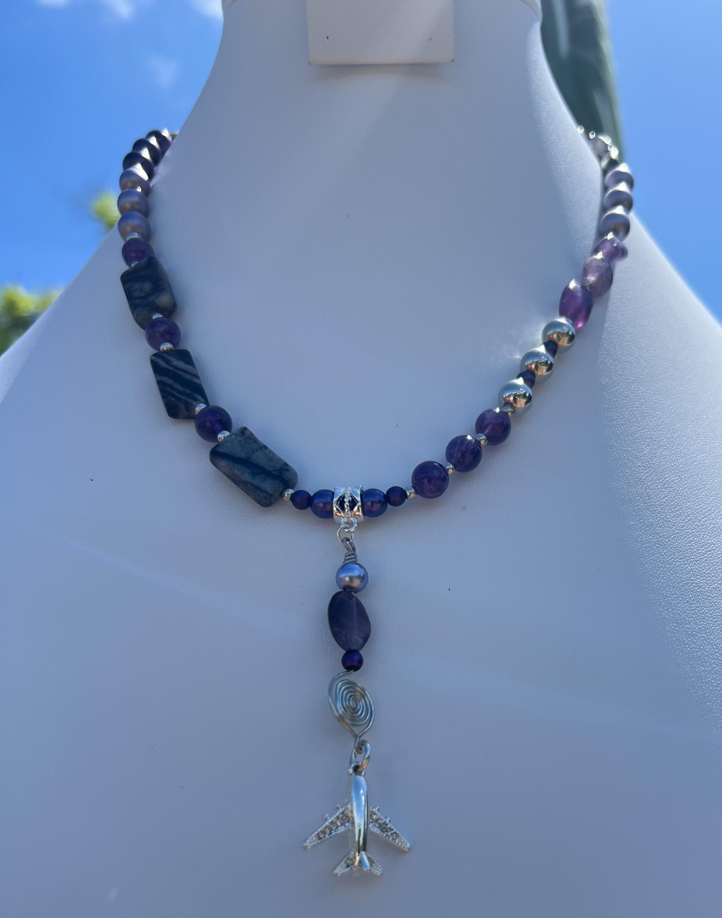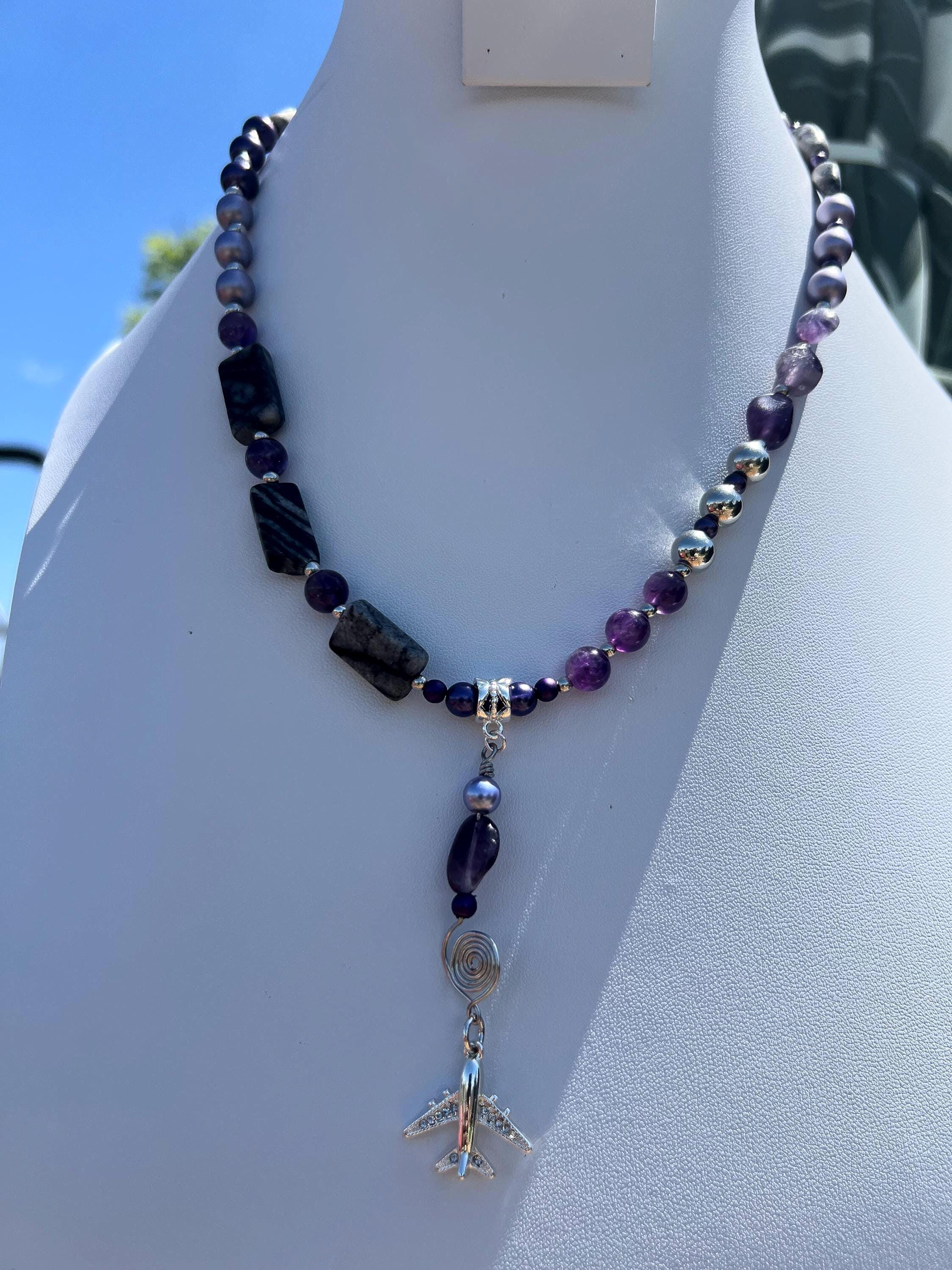 Handmade Airplane Necklace with Purple & Gray Stones and Beads, Travel Lover Gift