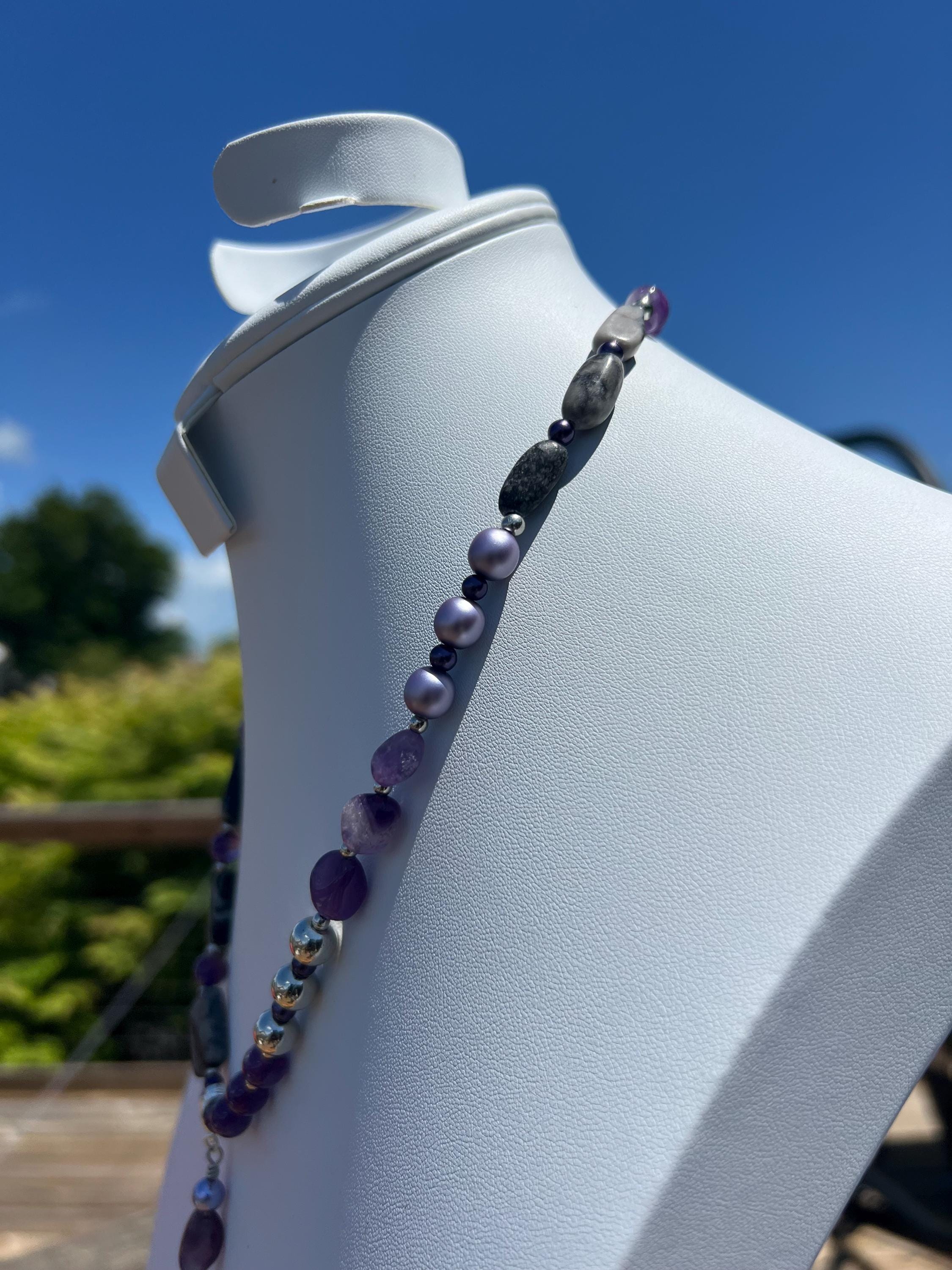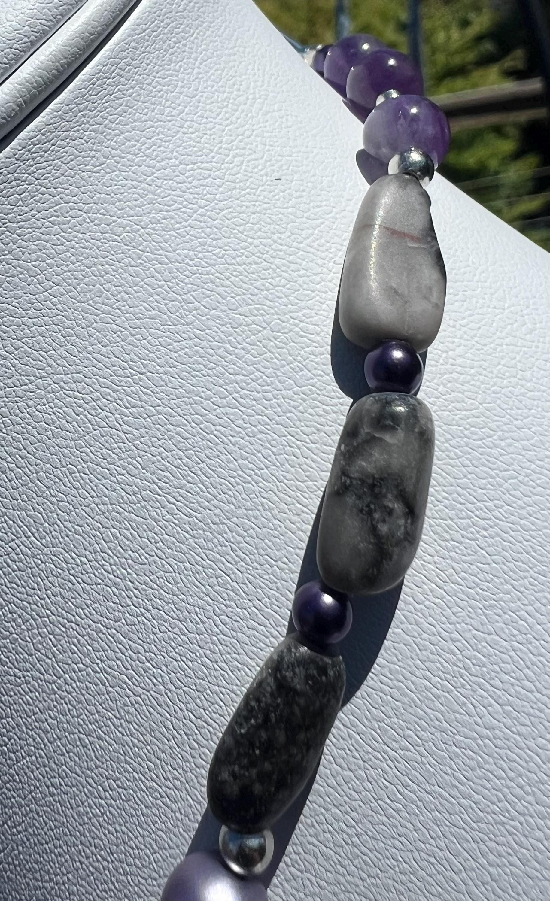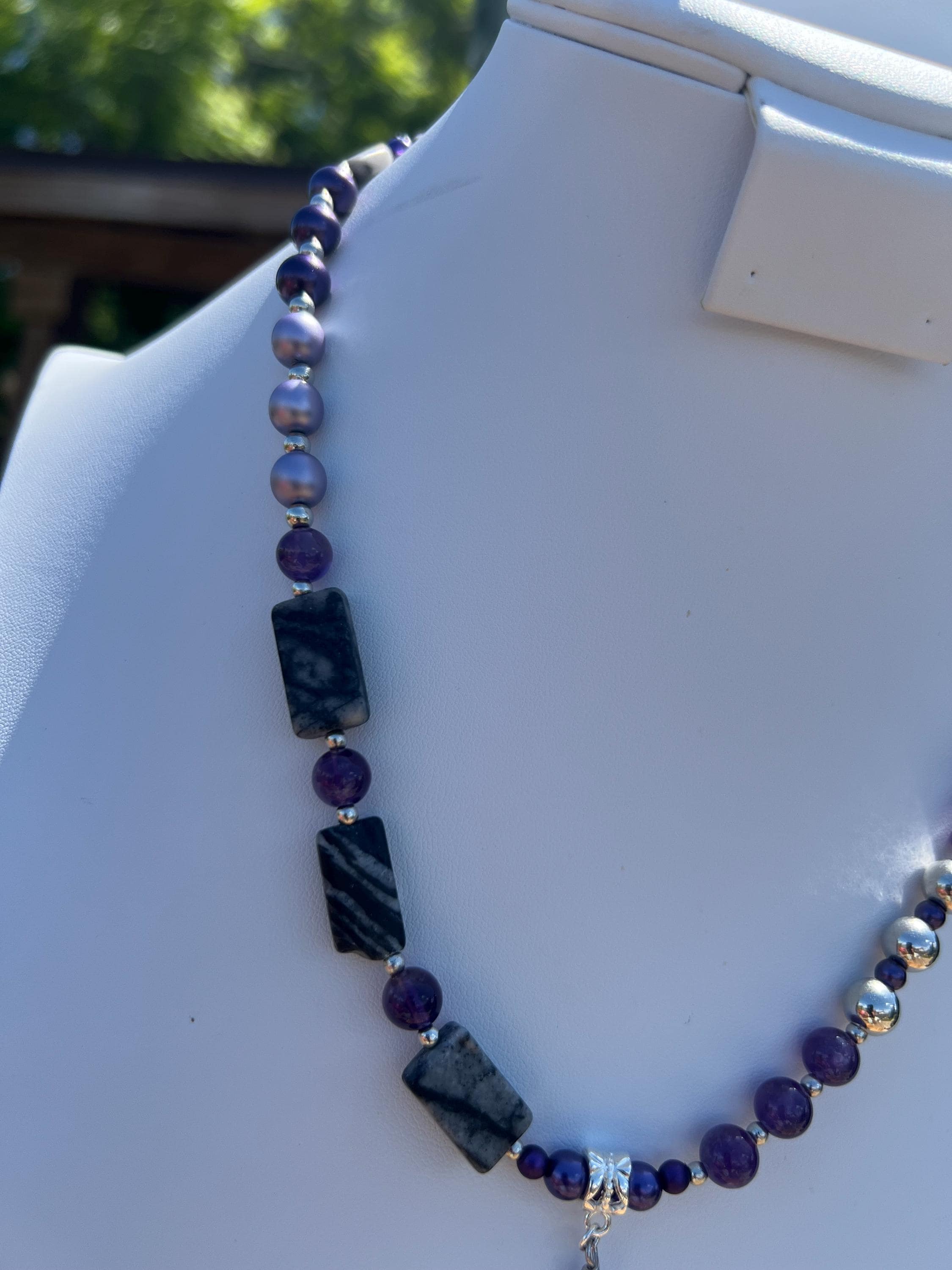 * Materials: Hyperstene, Dyed Pearl Glass, Gray Marble, Nickel Plated Silver and glass beads.