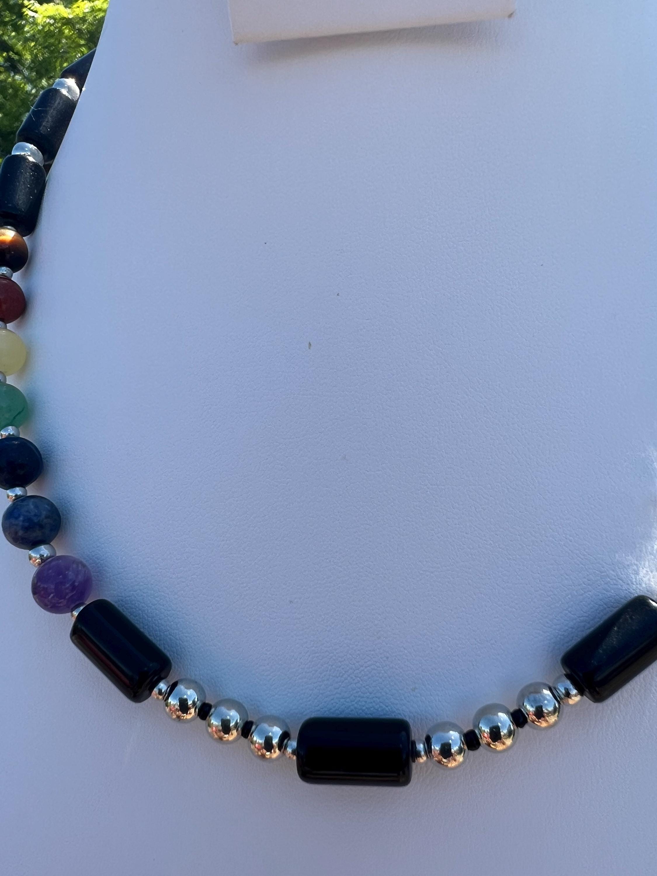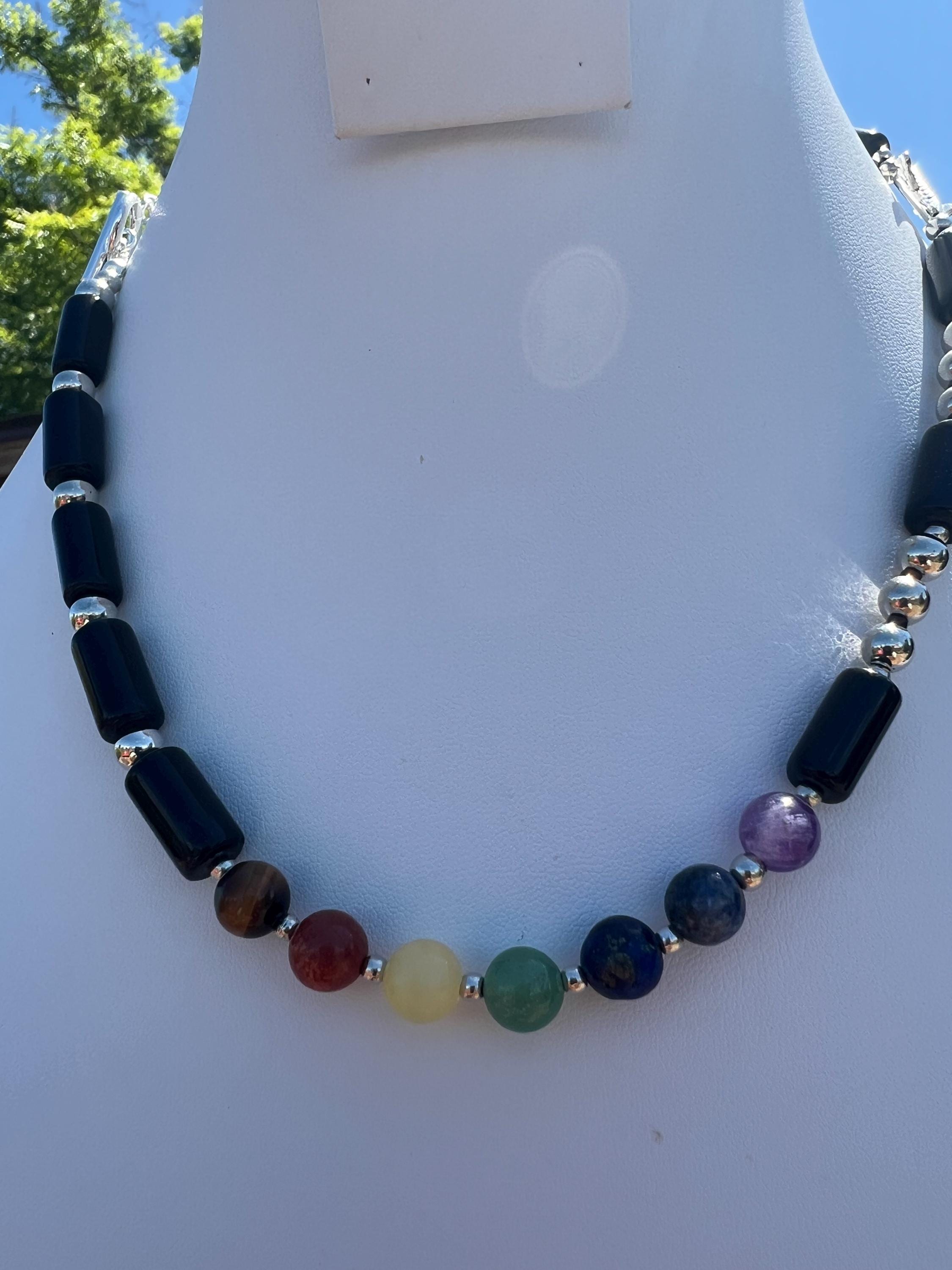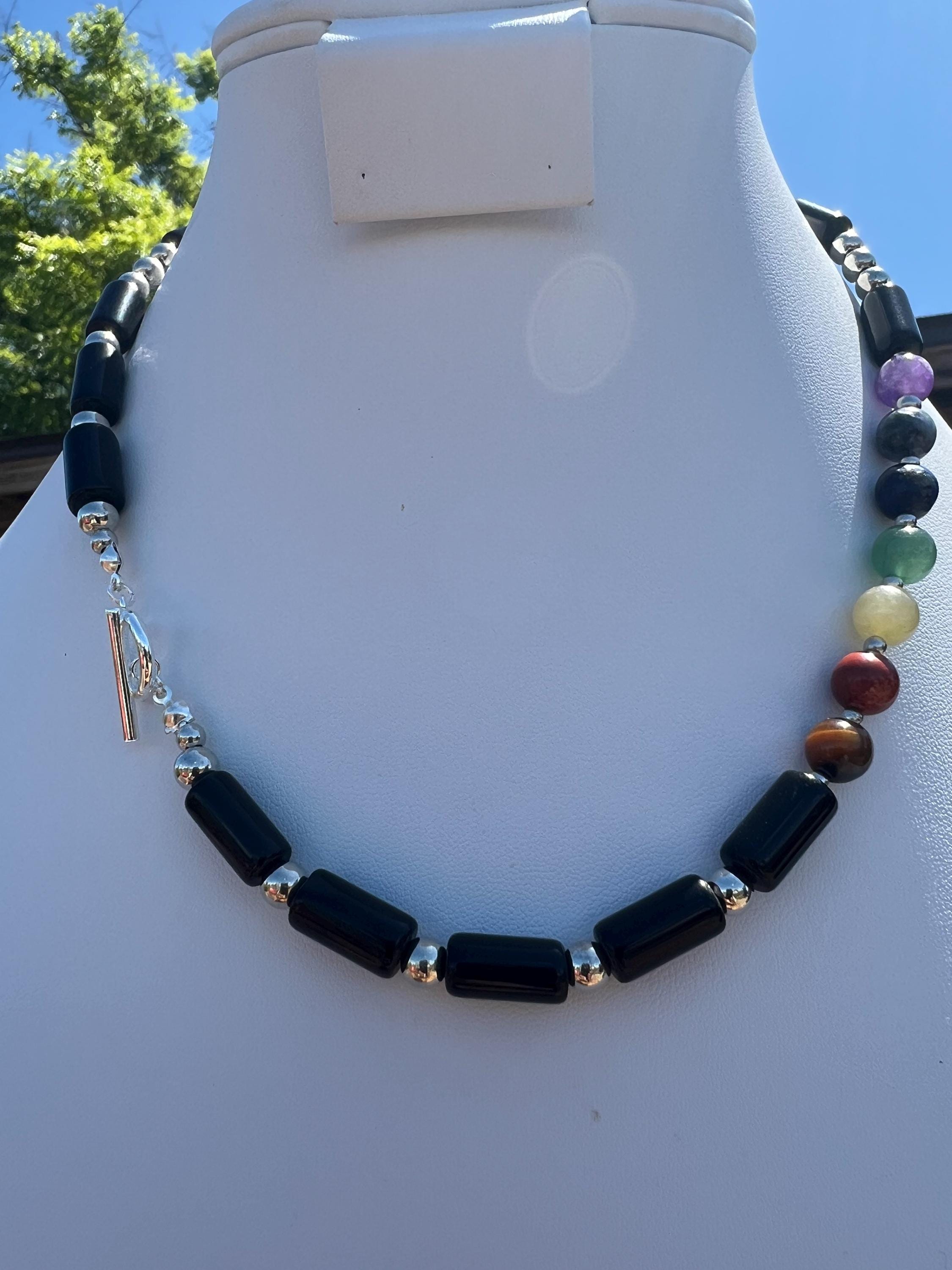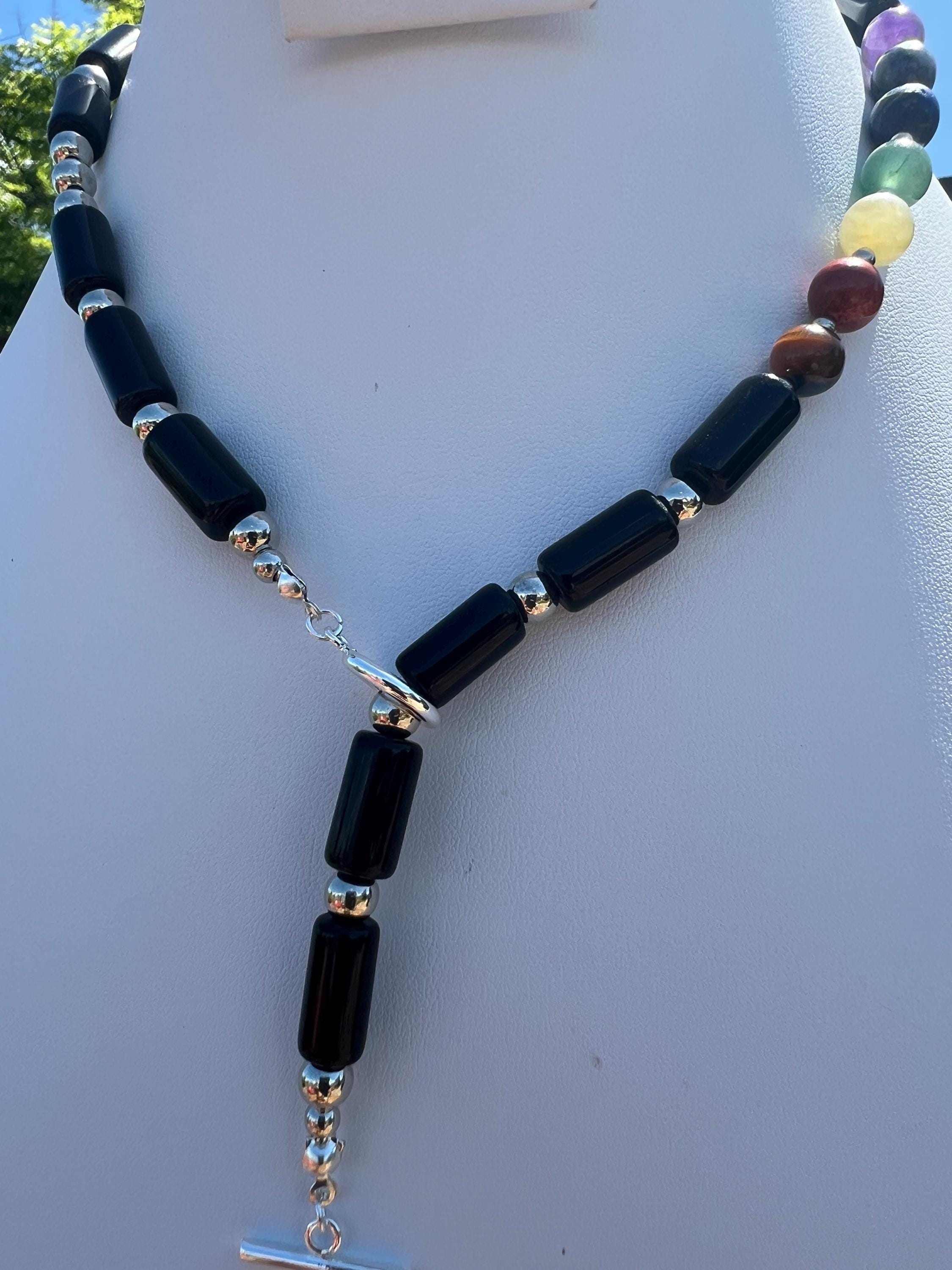 This necklace contains obsidian, steel and chakra-inspired beads, nickel plated silver finish aviation beads. Necklace closes with nickel plated silver finish toggle clasp: