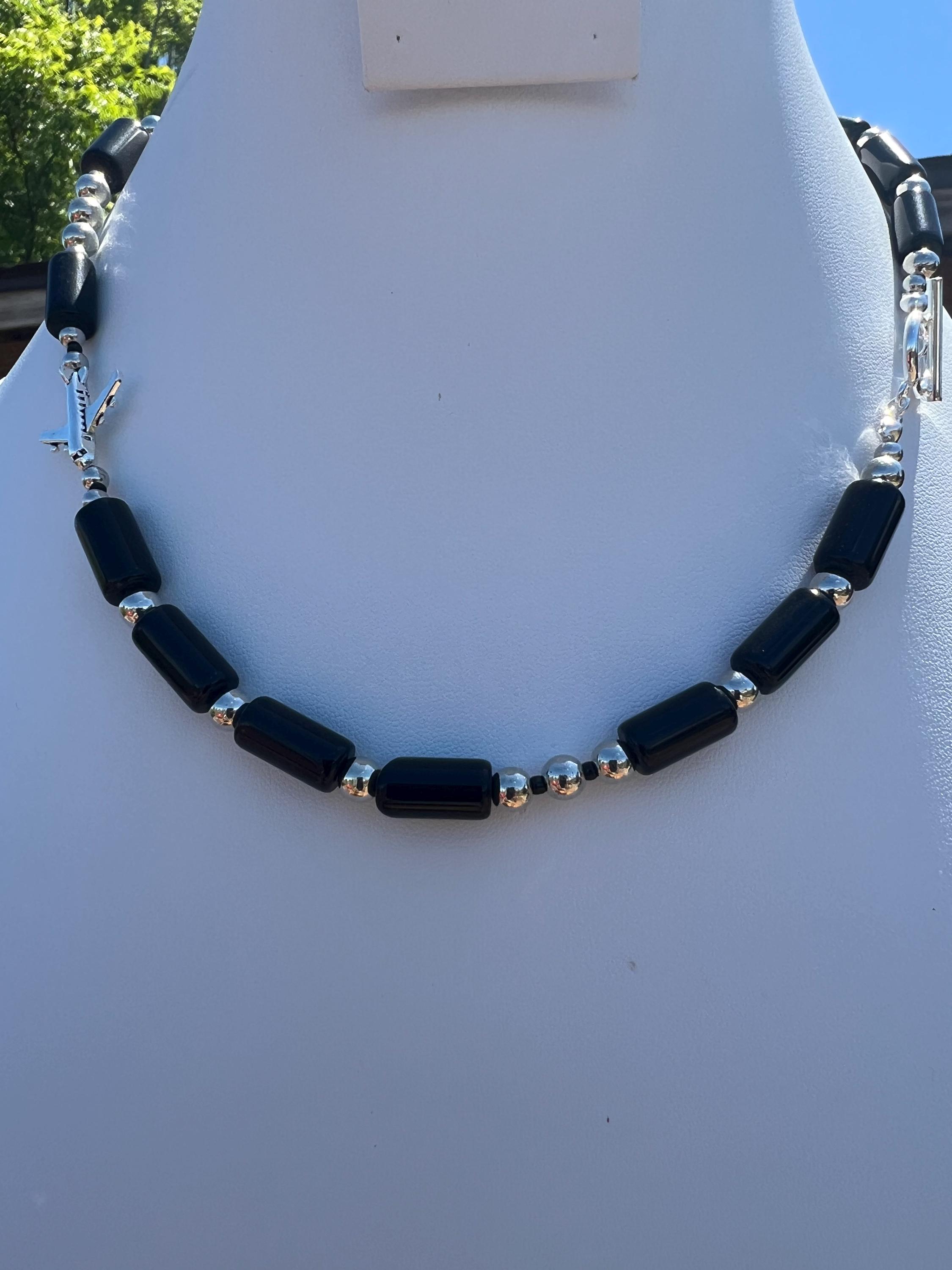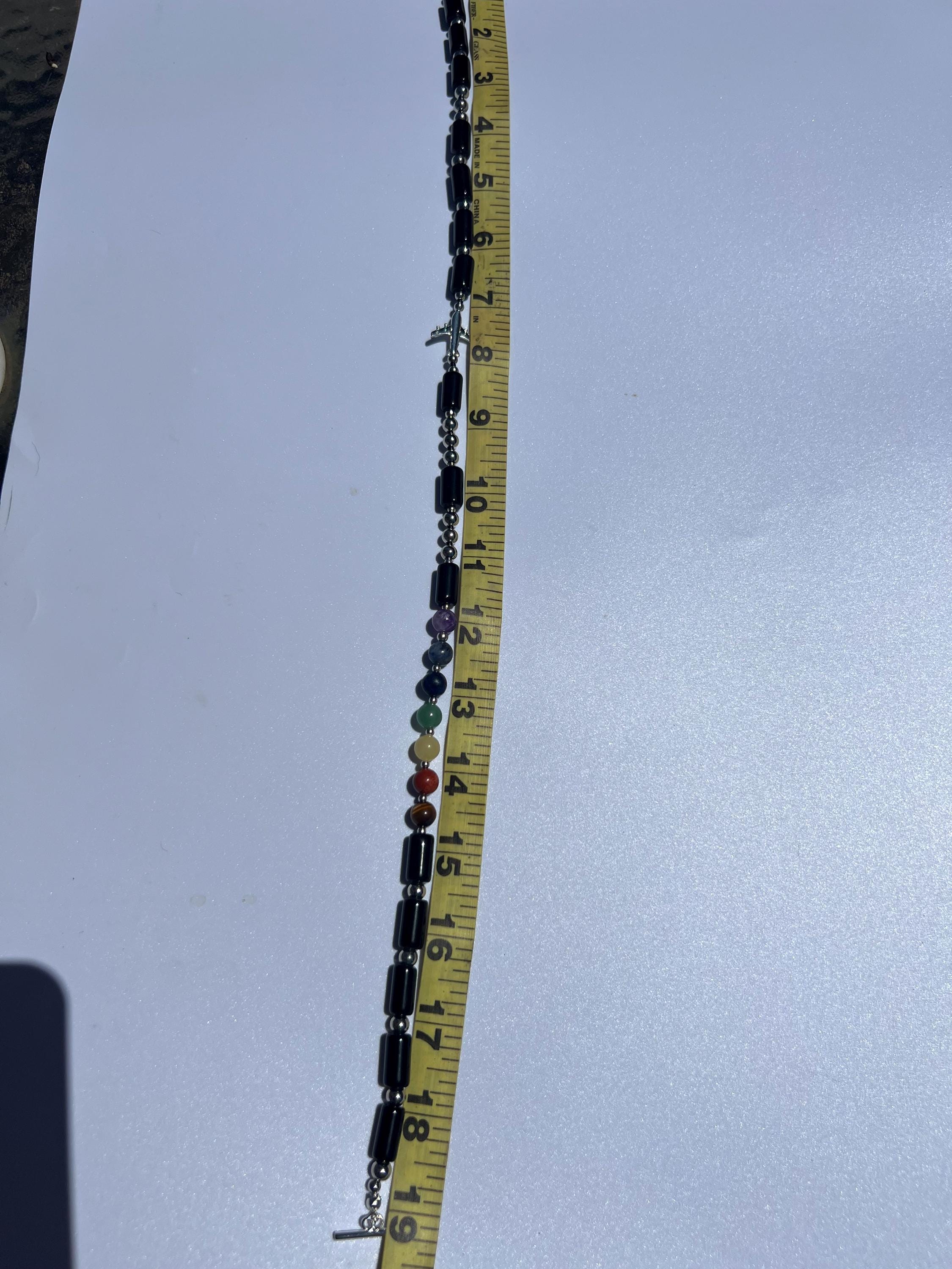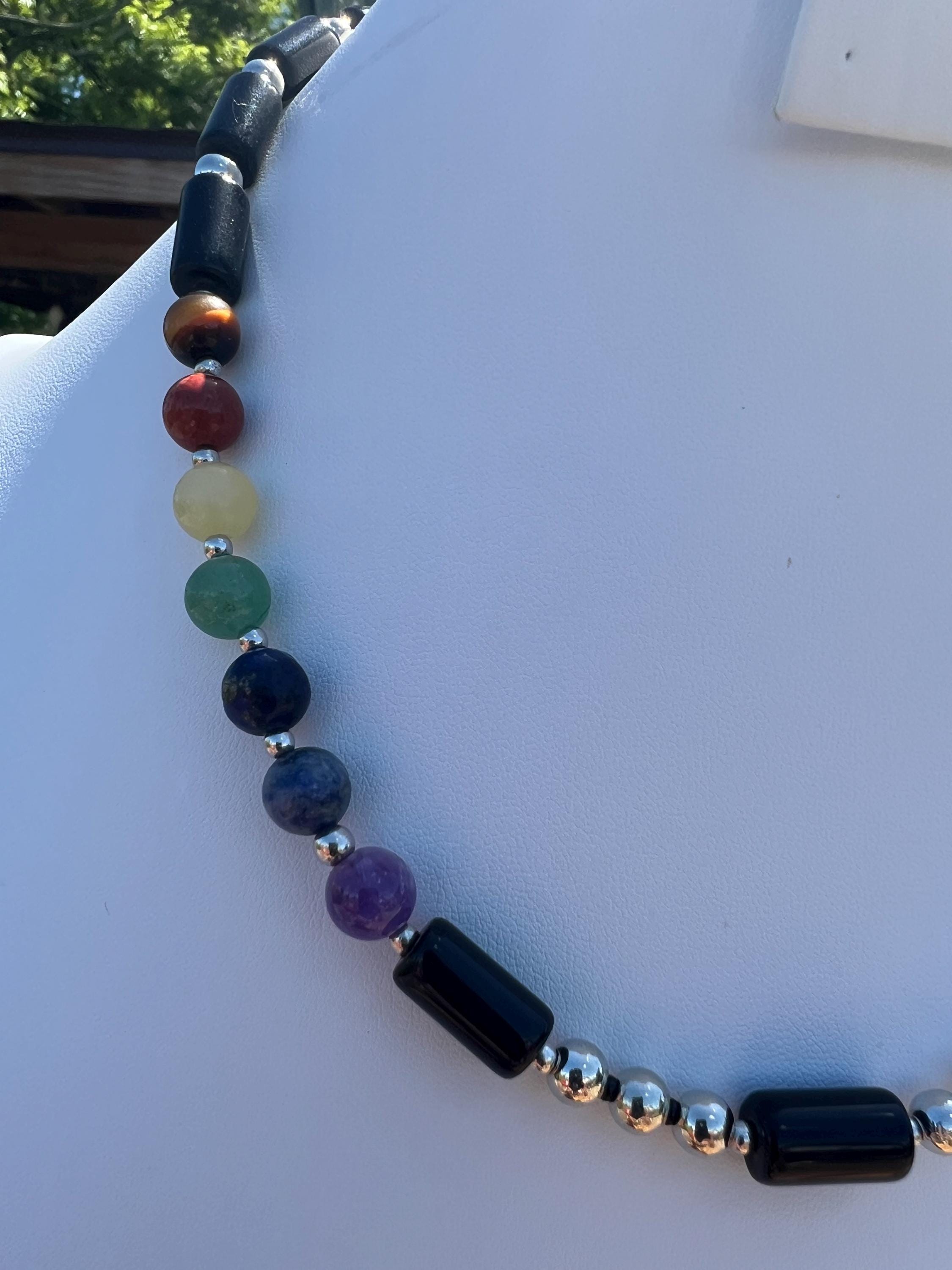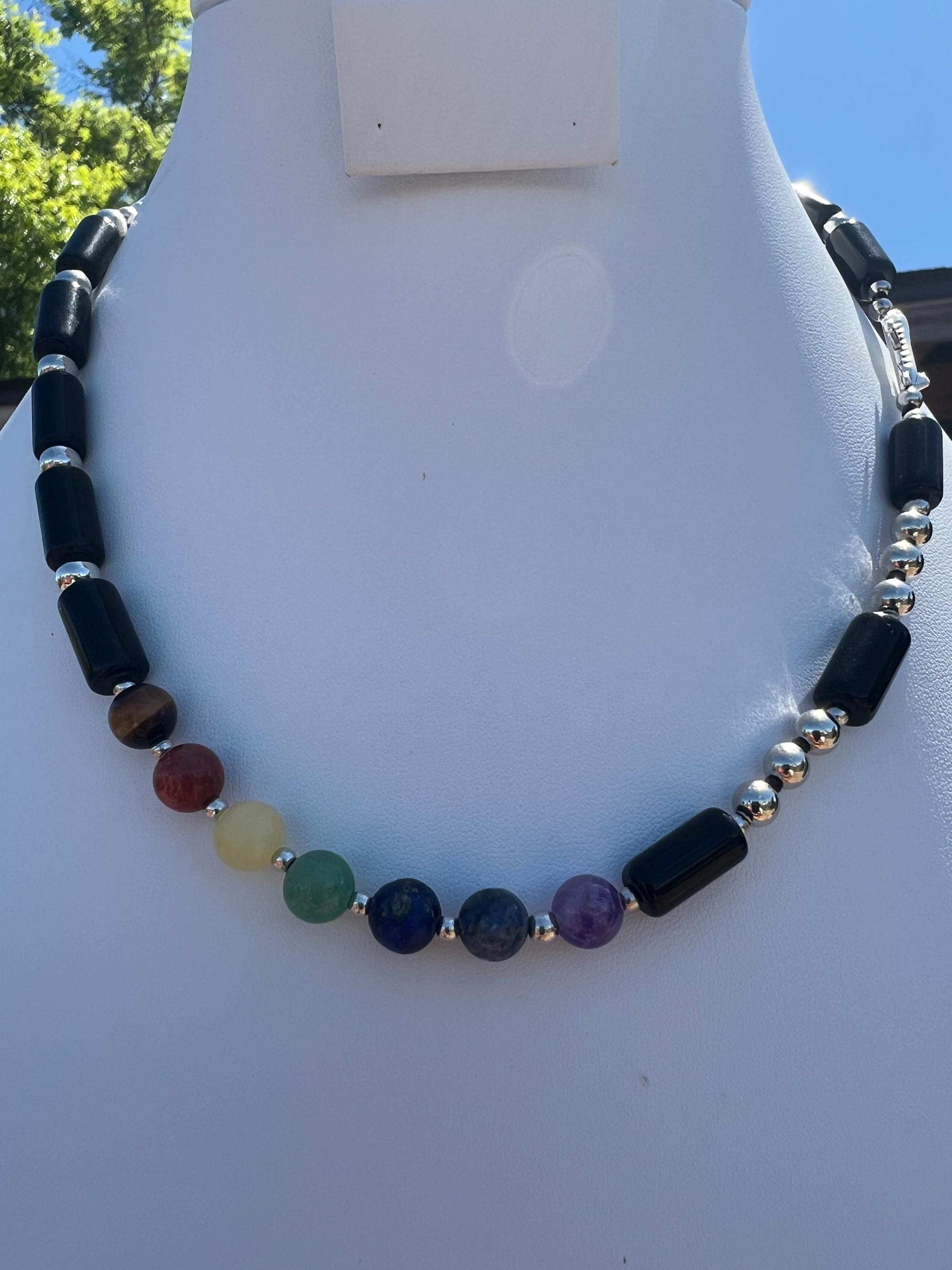 This necklace contains obsidian, steel and chakra-inspired beads, nickel plated silver finish aviation beads. Necklace closes with nickel plated silver finish toggle clasp: