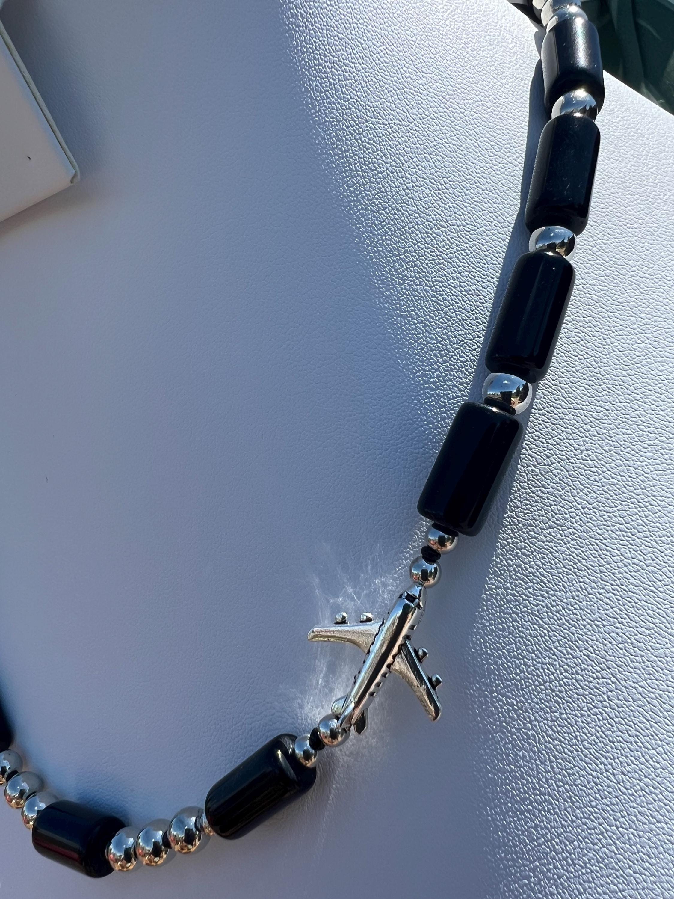 Aviation Necklace, Obsidian Tubes, Chakra Stones, Nickel Silver Airplane Beads