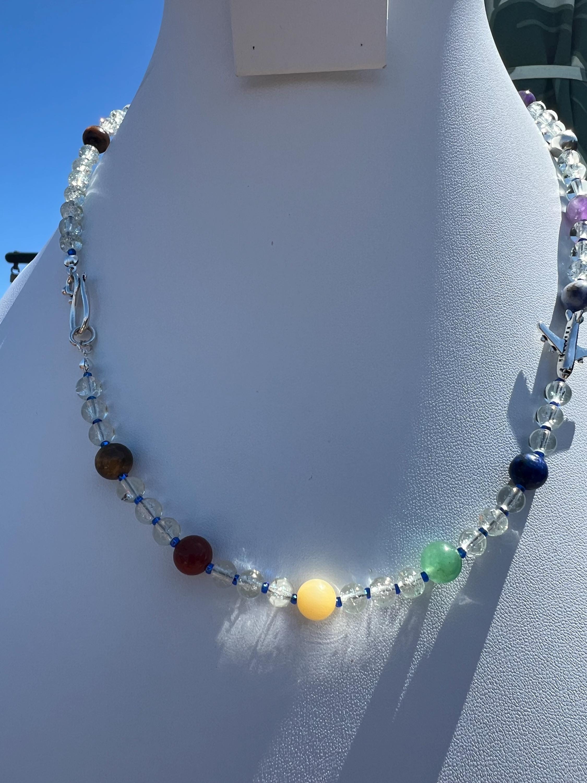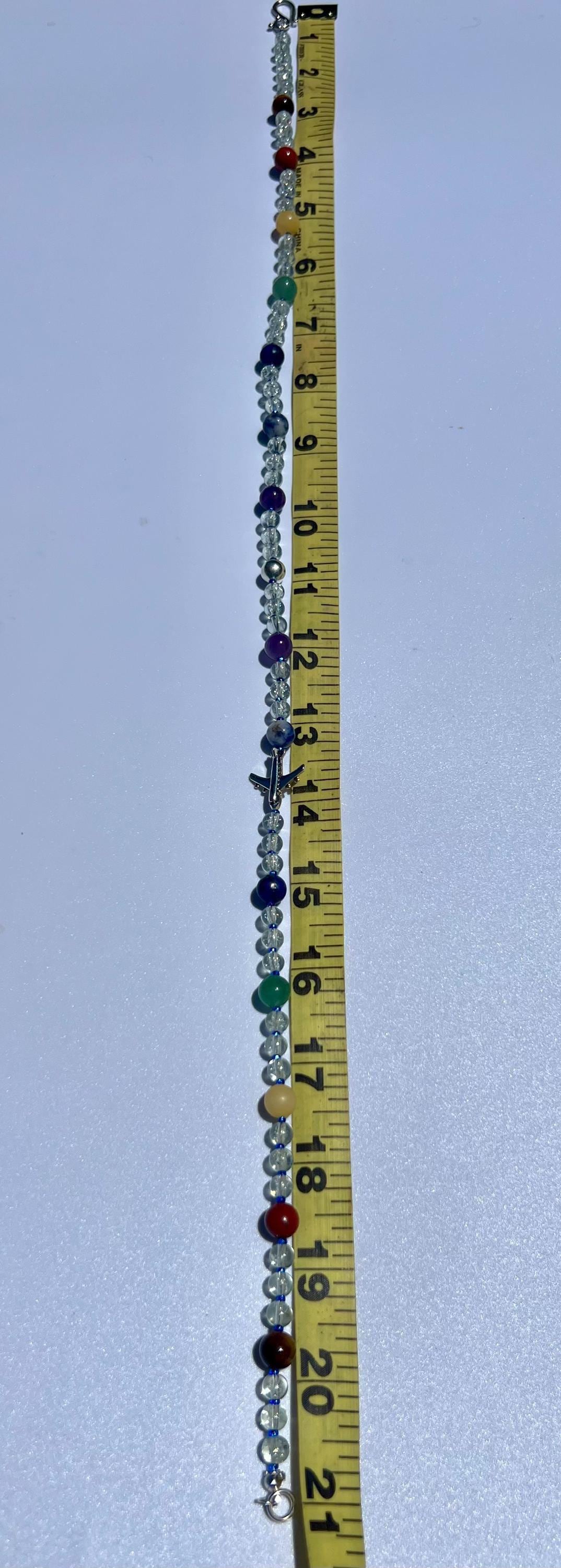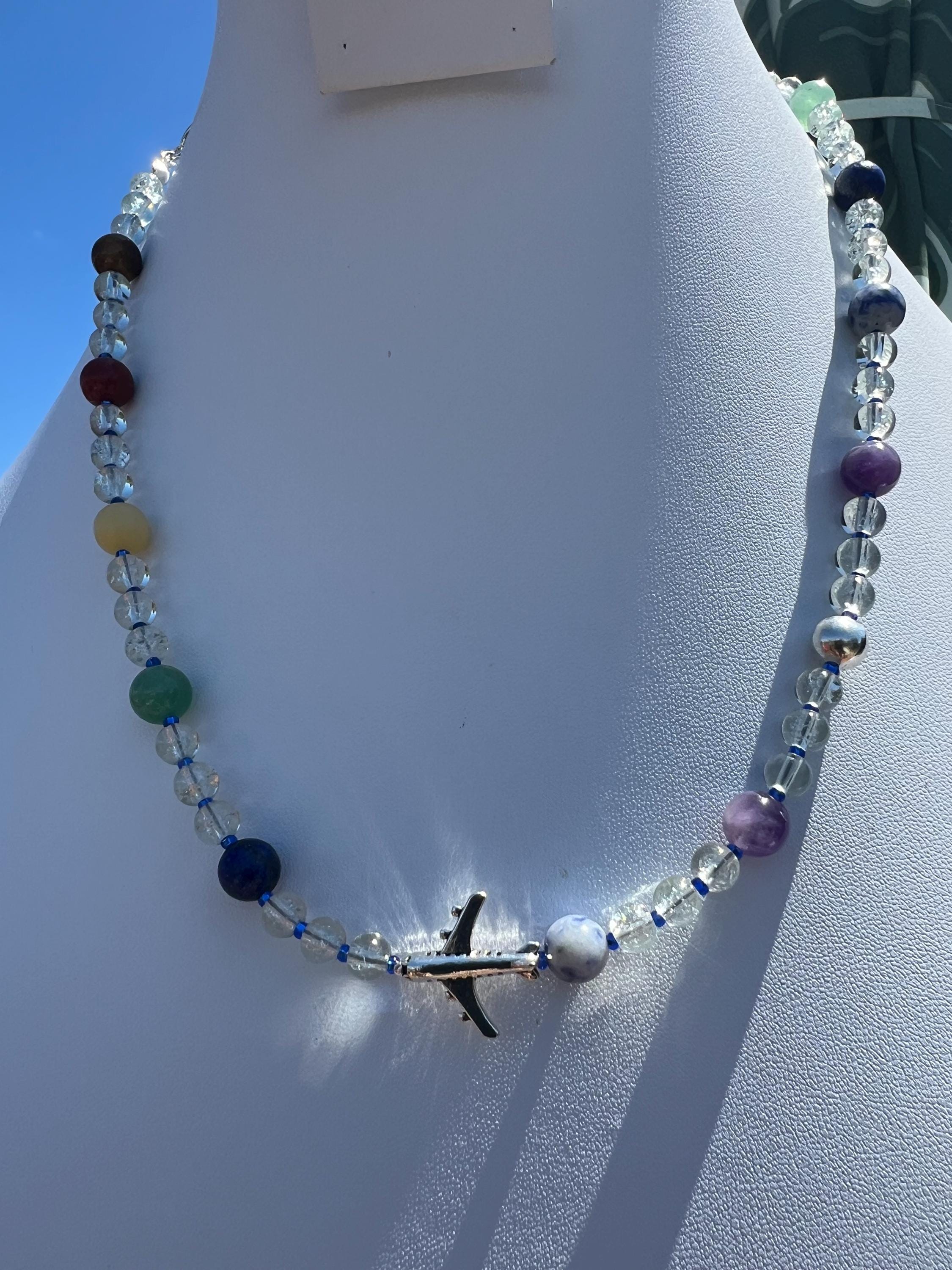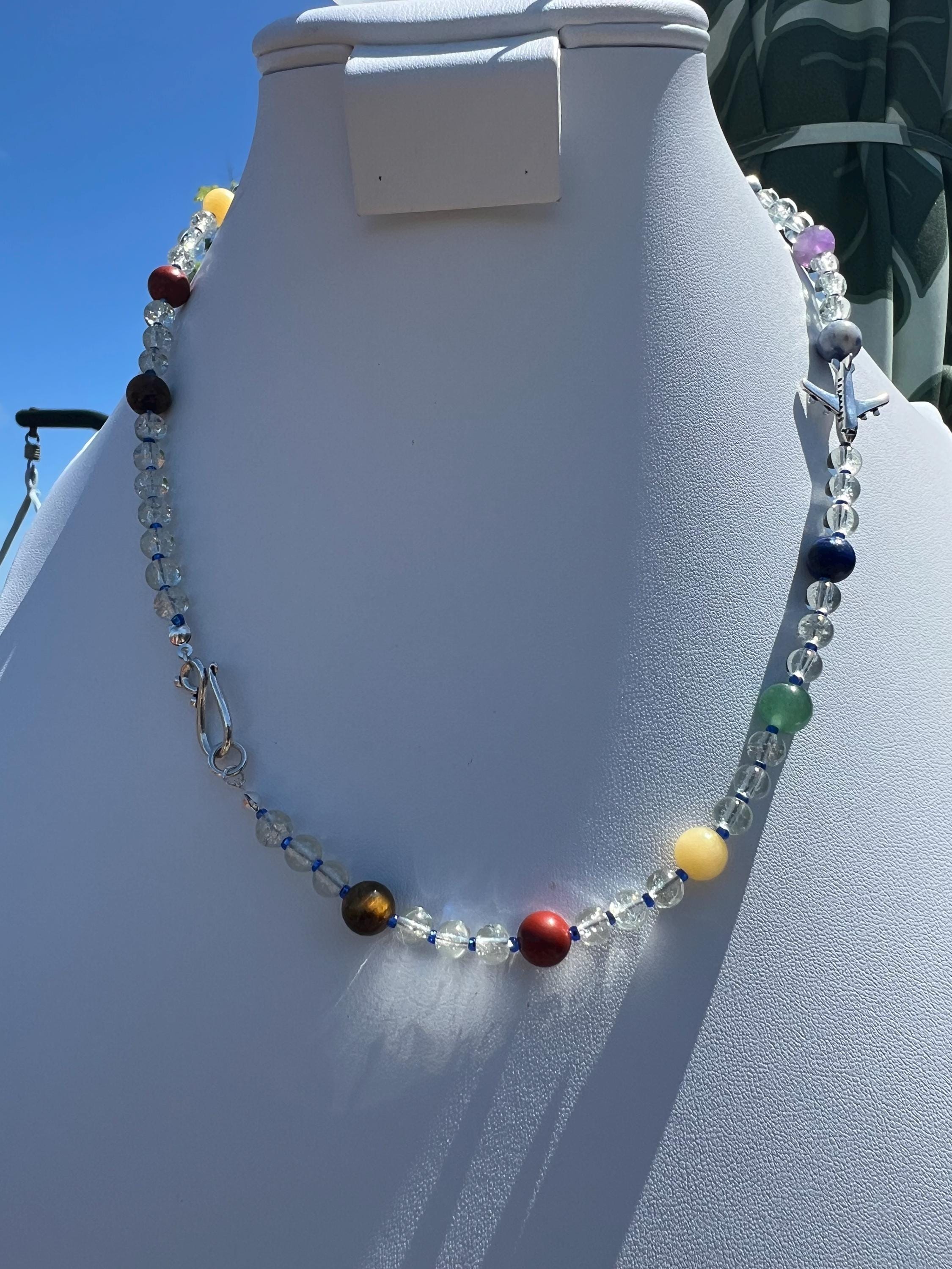 Handmade Aviation Necklace with Clear Glass and Chakra Inspired Stones, Fashionable Travel Lover Gift