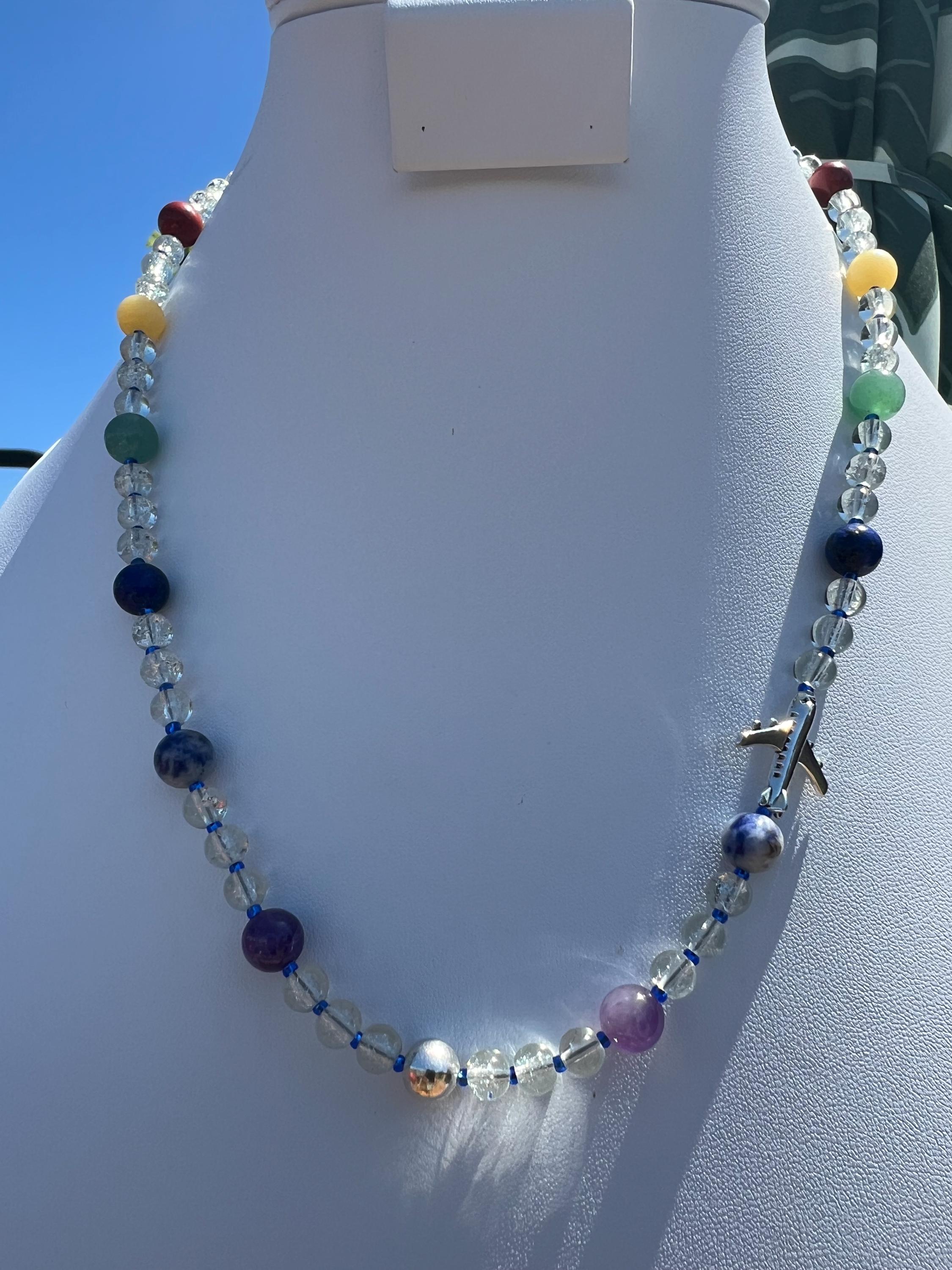 This necklace contains obsidian, steel and chakra-inspired beads, nickel plated silver finish aviation beads. Necklace closes with nickel plated silver finish S-clasp: