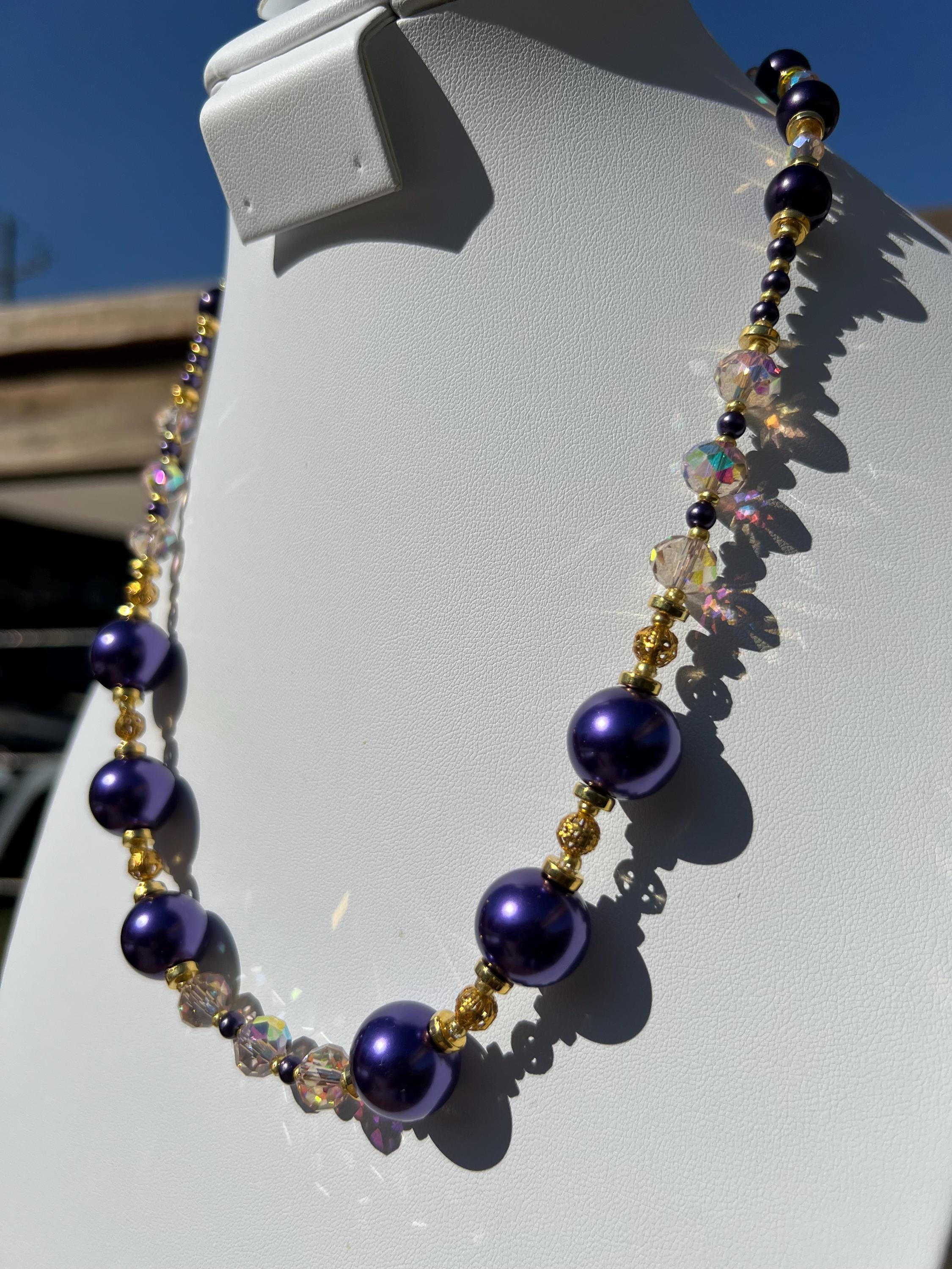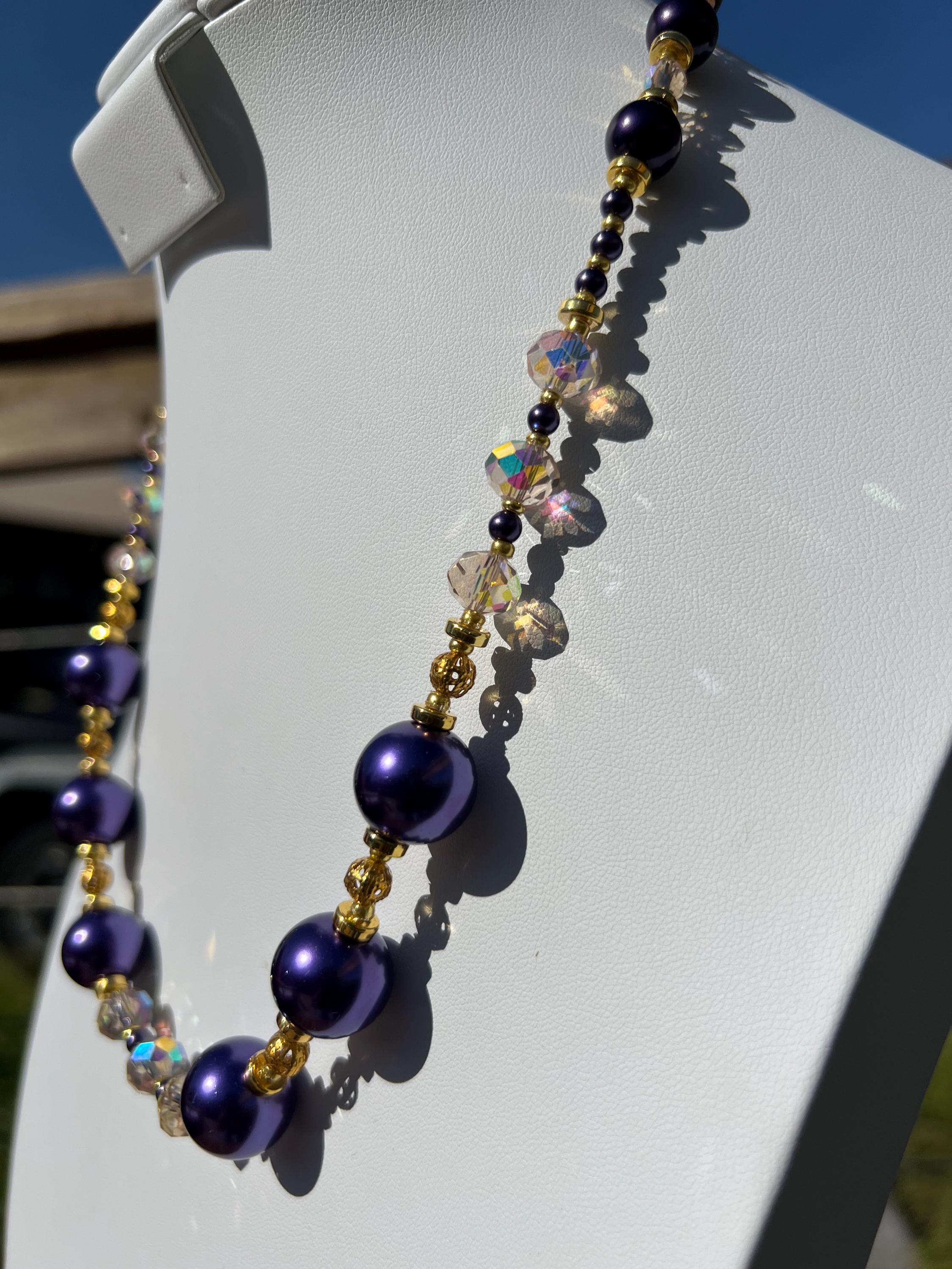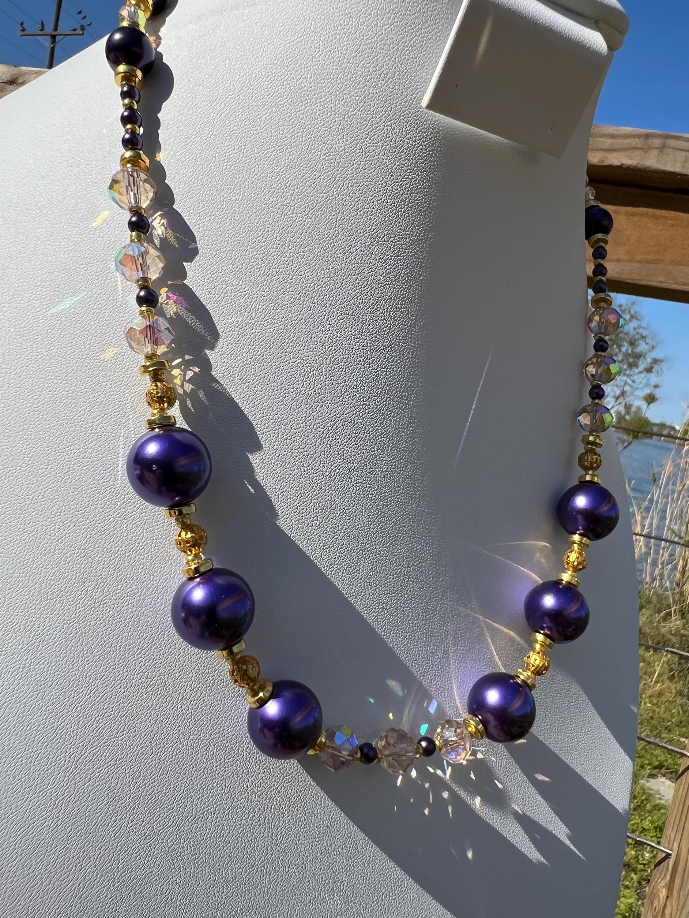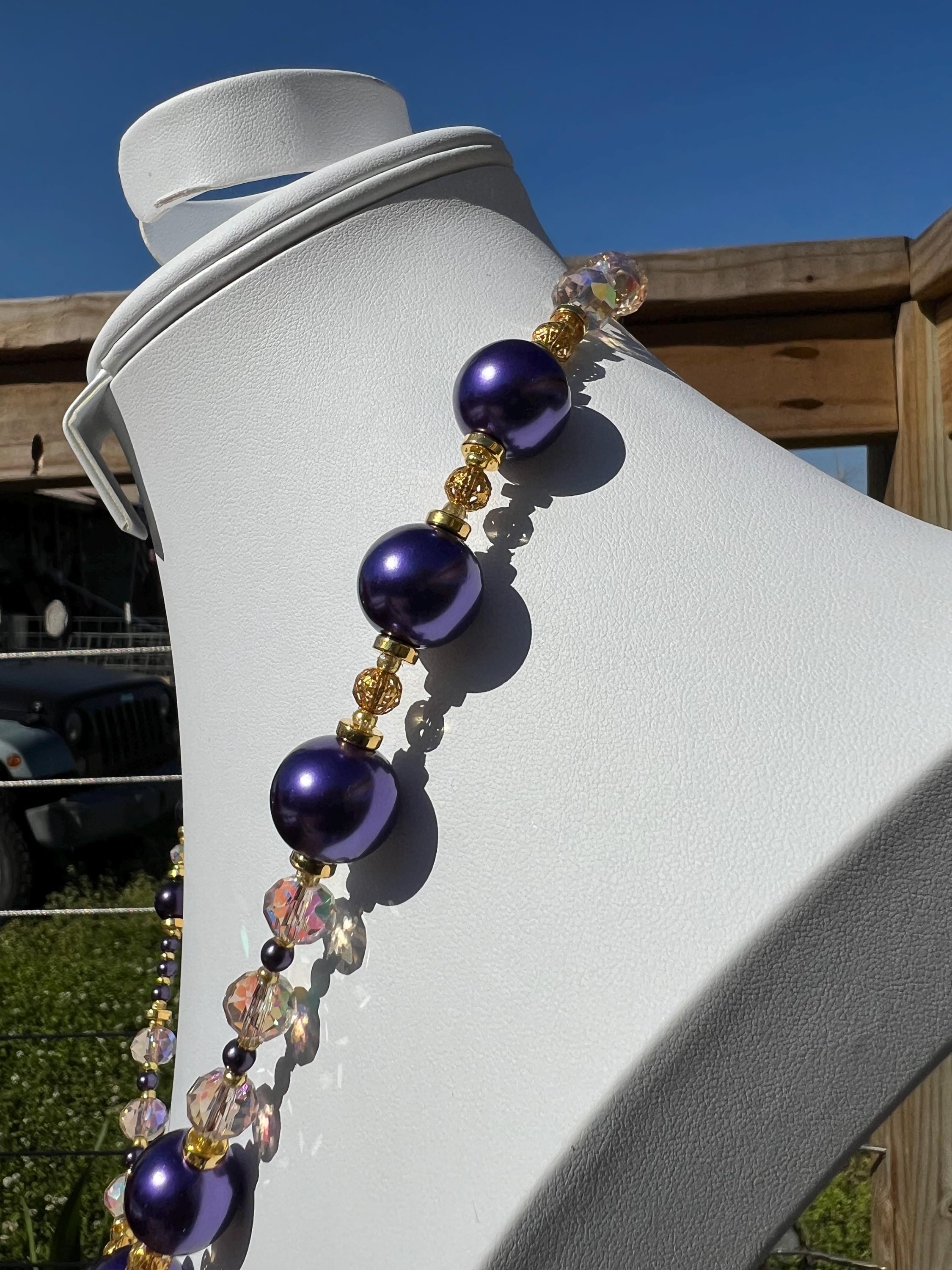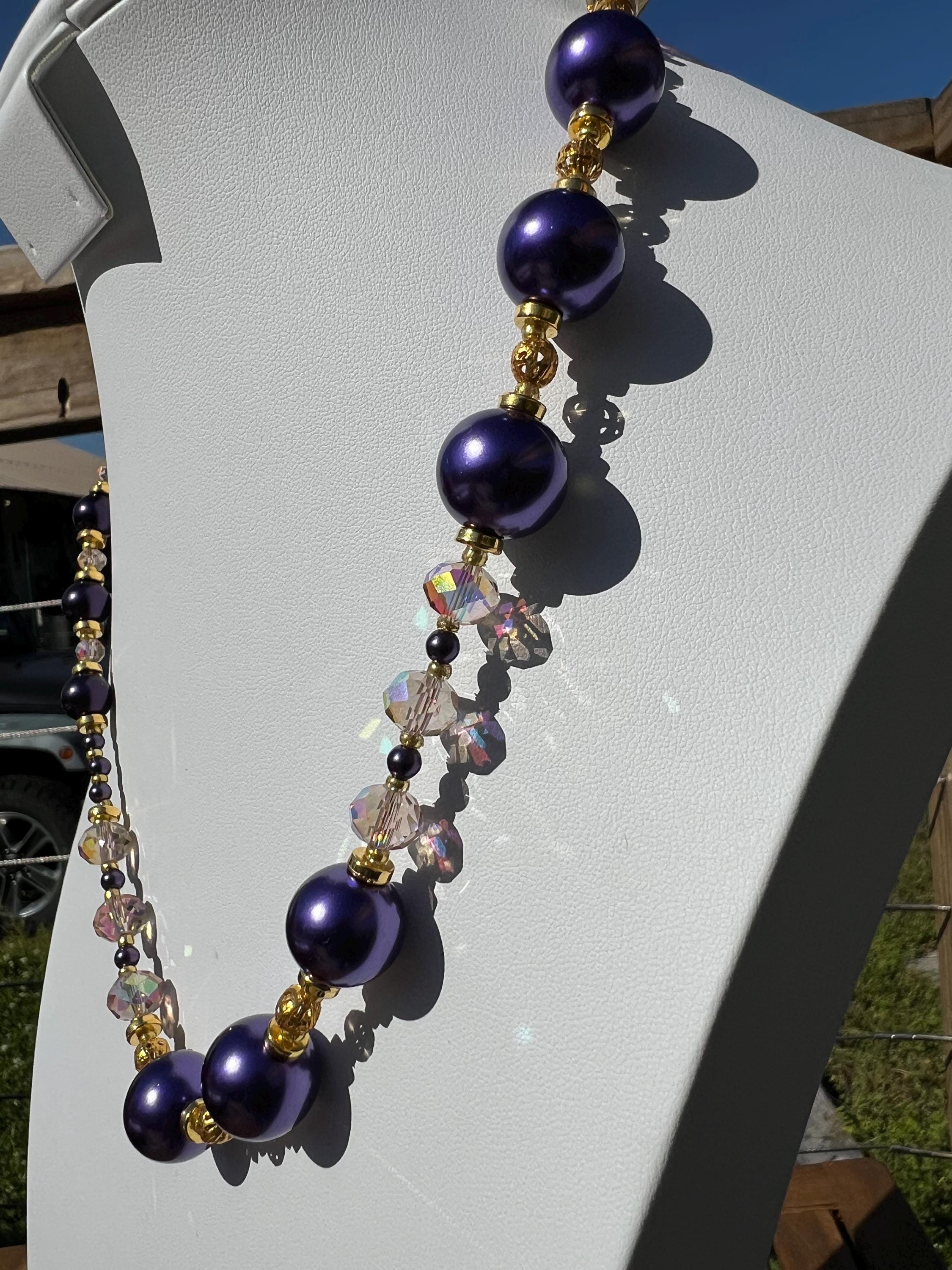 Purple, Gold and Rhinestone Beaded Necklace For Graduation Parties & Celebrations