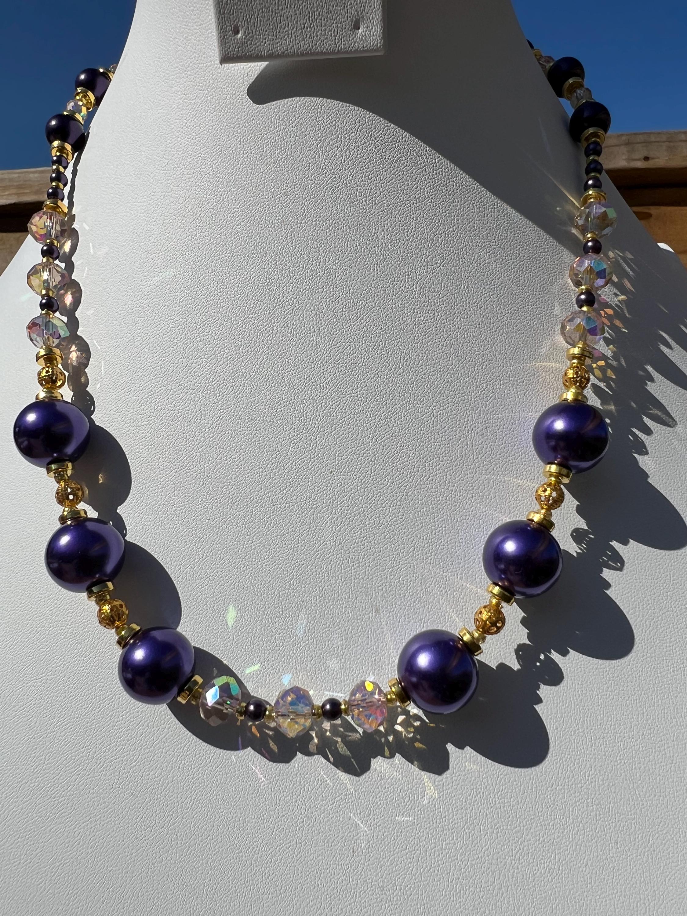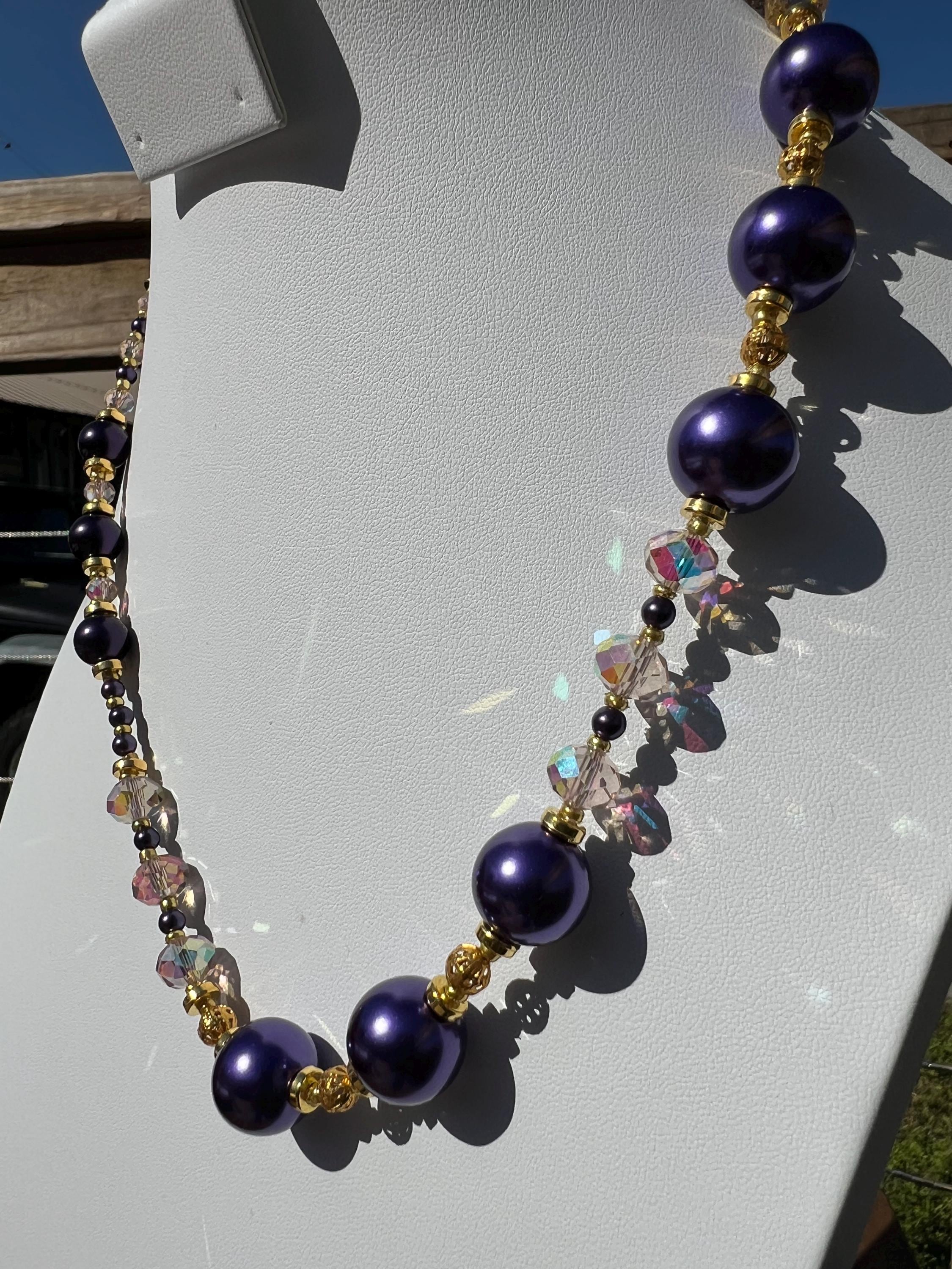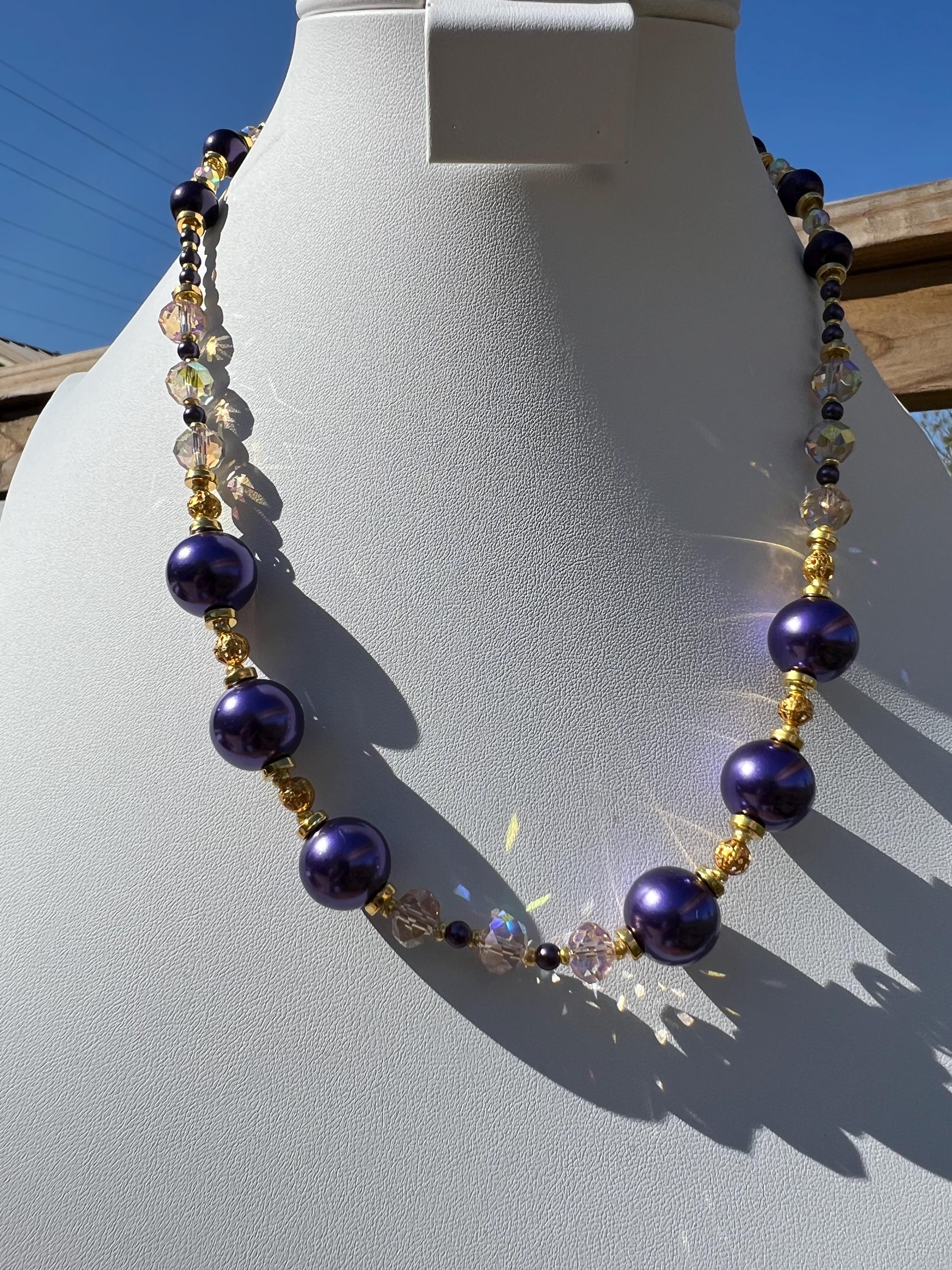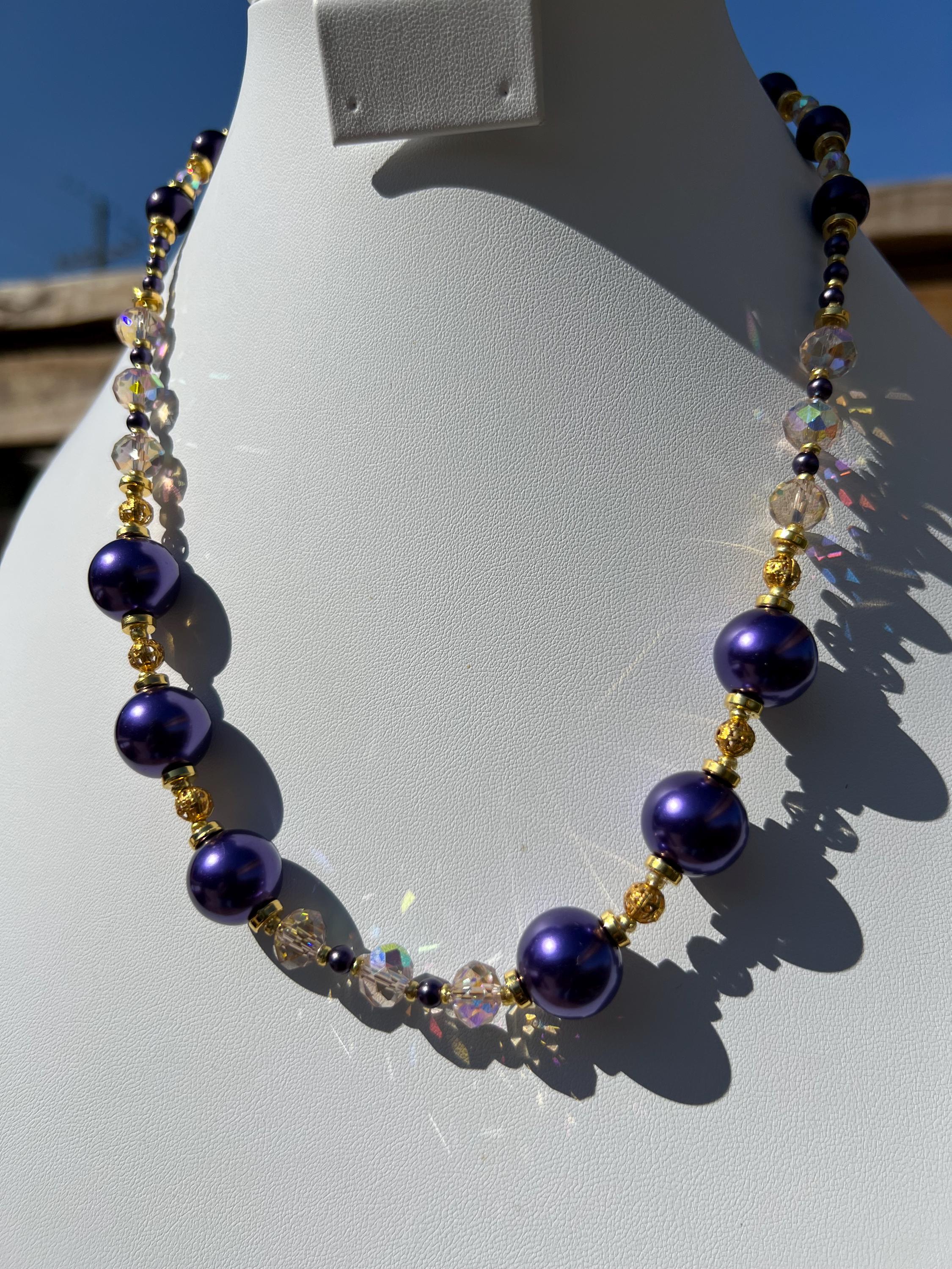 Purple, Gold and Rhinestone Beaded Necklace For Graduation Parties & Celebrations